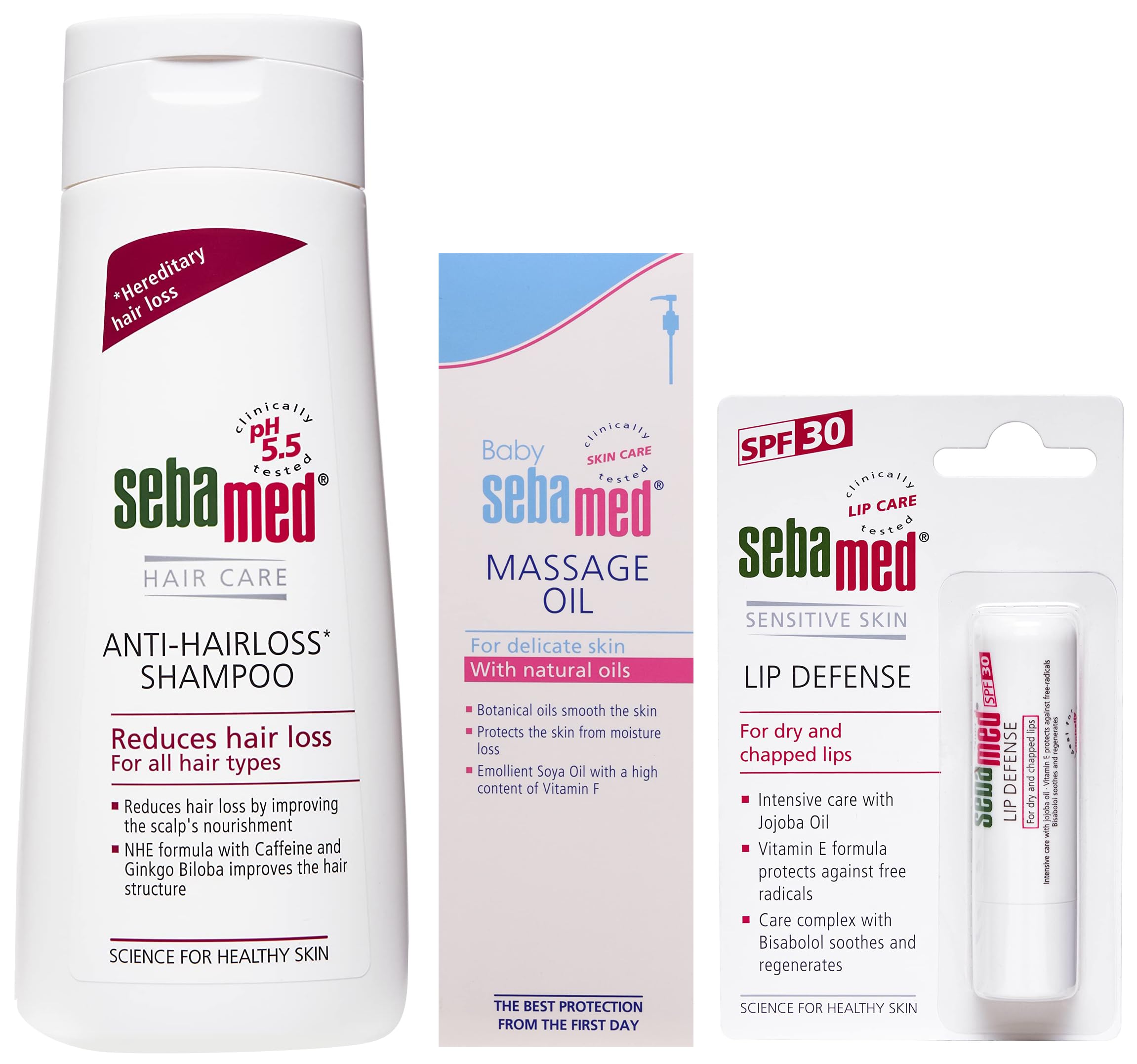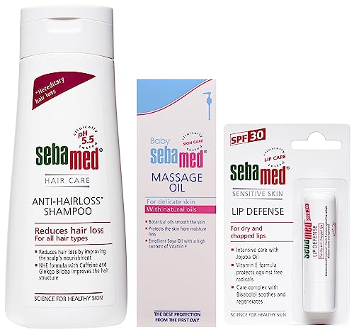 SebaMed Anti-Hairloss Shampoo 200mlSebamed anti-hair loss shampoo - soap and alkali- free reduces hair loss by activating scalp functions. NH complex derived from a vitamin b-like substance niacin promotes skin.SebaMed SPF 30 Lip Defense Stick 4.8gSebamed Lip Defense Stick SPF 30 For Dry And Chapped Lips - Protection Plus Prevent light induced blistering Protective smoothing care for the lips; Supports and protects the natural barrier function of the skin's acid mantle; Without preservatives; Product features: Against the irritating drying effects of environmental influences; Regenerates dry and chapped lips quickly and effectively alleviating irritation and inflammation with vitamin E and bisabolol (camomile extract) Nurtures sensitive lips with the intensive treatment properties of the essential plant extracts jojoba and rice bran protecting them from dehydration; Defends the tender lip tissue with UVA and UVB filters against sun burn and its consequences; Indications:Ideal care for dry chapped lips; Defends against UV rays.Sebamed Baby Massage Oil 150ml100 Percent botanical non sticky massage oil. Superior spread ability and faster absorption. Conventional massage oils contain mineral oil colorants and other irritants which can cause allergic reactions. Sebamed soothing massage oil contains 95 percent soy oil contains essential fatty acids which ensures superior hydration. 5 Percent wheat germ oil is the richest source of vitamin e. Sebamed soothing massage oil does not solidify at lower temperature made in Germany gentle care and protection of babyâs sensitive skin emollient with 95 percent natural soya oils high content of formula with vitamin f a soya oil compound insures high skin tolerability gentle protection for delicate baby skin ideal from day 7 2 years0 percent irritant reactions and almost 0 percent allergic reactions.