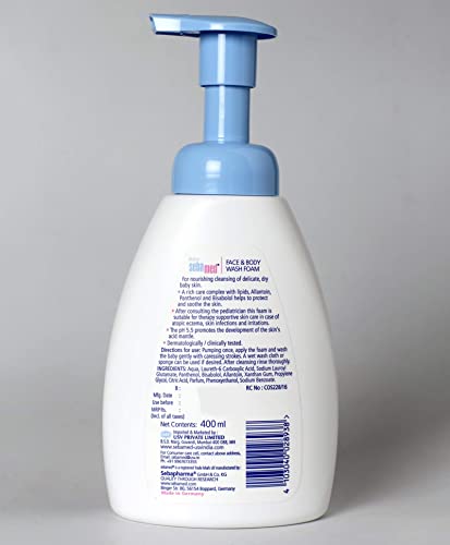 Sebamed Baby Face & Body Wash Foam|Ph 5.5|With Panthenol & natural Bisabolol| For delicate dry skinBaby Sebamed Face & Body Wash Foam 400ml Baby Sebamed Face & Body Wash Foam is a very mild cleansing foam which helps to prevent dryness of the baby's skin.Sebamed Baby Shampoo 150ml|Ph 5.5| Camomile|Natural moisturisers|No tears formula|For delicate scalpSebamed children's shampoo has ph of 5. 5 And has sugar based mild cleanser. Other children shampoos have ph greater 7 and chemicals like formaldehyde phthalates sls which leads to allergic reactions. At ph 5. 5 Alone the scalp barrier remains intact. It has been clinically proven that only at ph 5. 5 Scalp is hydrated and strengthens scalp for optimal hair growth. Lipid and moisture loss is minimum and the growth of malassezia which leads to dandruff is restricted. Sebamed children's shampoo is free from irritants and hence has 0 percent incidences of irritant reactions. Sebamed children's shampoo contains botanical ingredient hence the reported incidence of allergic reaction is 0. 000003 Percent. Only at ph5. 5 The baby's delicate eyes are not irritated and the tear free formula is free from formaldehyde. Sebamed children's shampoo is ideal for cradle cap seborrheic dermatitis and dandruff. Made in germany100 percent soap and alkali free especially mild cleansers for gentle cleansing without irritating the scalp or hair herbal extract of chamomile alleviates irritation and soothes the skin special âno tearsâ formula does not sting in the eyes leaves hair fragrant and silky pleasant botanical fragrance ideal from six month onwards clinically proven suitability for cleansing of hair and scalp in babies and infants with sensitive scalp was proven in the dermatological study. Users documented an excellent acceptance of the shampoo and 93 percent were willing to continue using it.