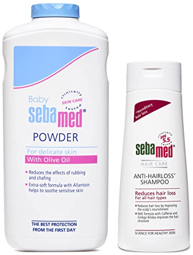 Sebamed Baby Powder 400gMicronized form of tio2 reduces the effect of rubbing and chafing. Absorbs extra moisture from baby's skin to help skin feel comfortable. Extra soft formula with Allentown helps in protecting baby's delicate skin against irritation. Olive oil present in seamed baby powder soothes and protects baby's skin from dryness. Made in Germany olive oil soothes and protects the baby's skin from dryness allantoin makes the skin soft and smooth pleasant botanical fragrance ideal from one month onwards0 percent irritant reactions and almost 0 percent allergic reactions.SebaMed Anti-Hairloss Shampoo 200mlSebamed anti-hair loss shampoo - soap and alkali- free reduces hair loss by activating scalp functions. NH complex derived from a vitamin b-like substance niacin promotes skin.