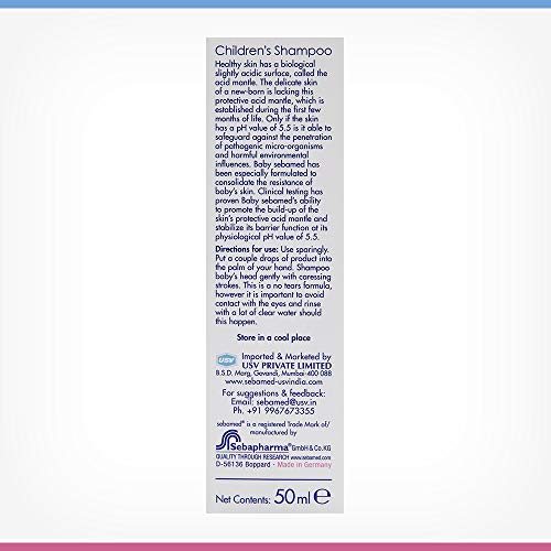 Sebamed Baby Powder with Honeysuckle 200gxtra soft formula with HoneysuckleHelps prevent heat rashes.Sebamed Childrenâs Shampoo (50ml)Sebamed children's shampoo has ph of 5. 5 And has sugar based mild cleanser. Other children shampoos have ph greater 7 and chemicals like formaldehyde phthalates sls which leads to allergic reactions. At ph 5. 5 Alone the scalp barrier remains intact. It has been clinically proven that only at ph 5. 5 Scalp is hydrated and strengthens scalp for optimal hair growth. Lipid and moisture loss is minimum and the growth of malassezia which leads to dandruff is restricted. Sebamed children's shampoo is free from irritants and hence has 0 percent incidences of irritant reactions. Sebamed children's shampoo contains botanical ingredient hence the reported incidence of allergic reaction is 0. 000003 Percent. Only at ph5. 5 The baby's delicate eyes are not irritated and the tear free formula is free from formaldehyde. Sebamed children's shampoo is ideal for cradle cap seborrheic dermatitis and dandruff. Made in germany100 percent soap and alkali free especially mild cleansers for gentle cleansing without irritating the scalp or hair herbal extract of chamomile alleviates irritation and soothes the skin special âno tearsâ formula does not sting in the eyes leaves hair fragrant and silky pleasant botanical fragrance ideal from six month onwards clinically proven suitability for cleansing of hair and scalp in babies and infants with sensitive scalp was proven in the dermatological study. Users documented an excellent acceptance of the shampoo and 93 percent were willing to continue using it.