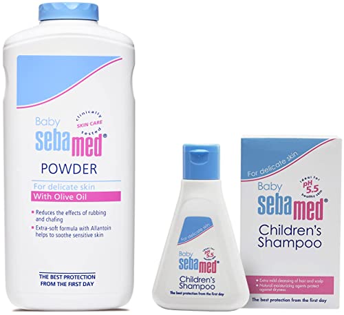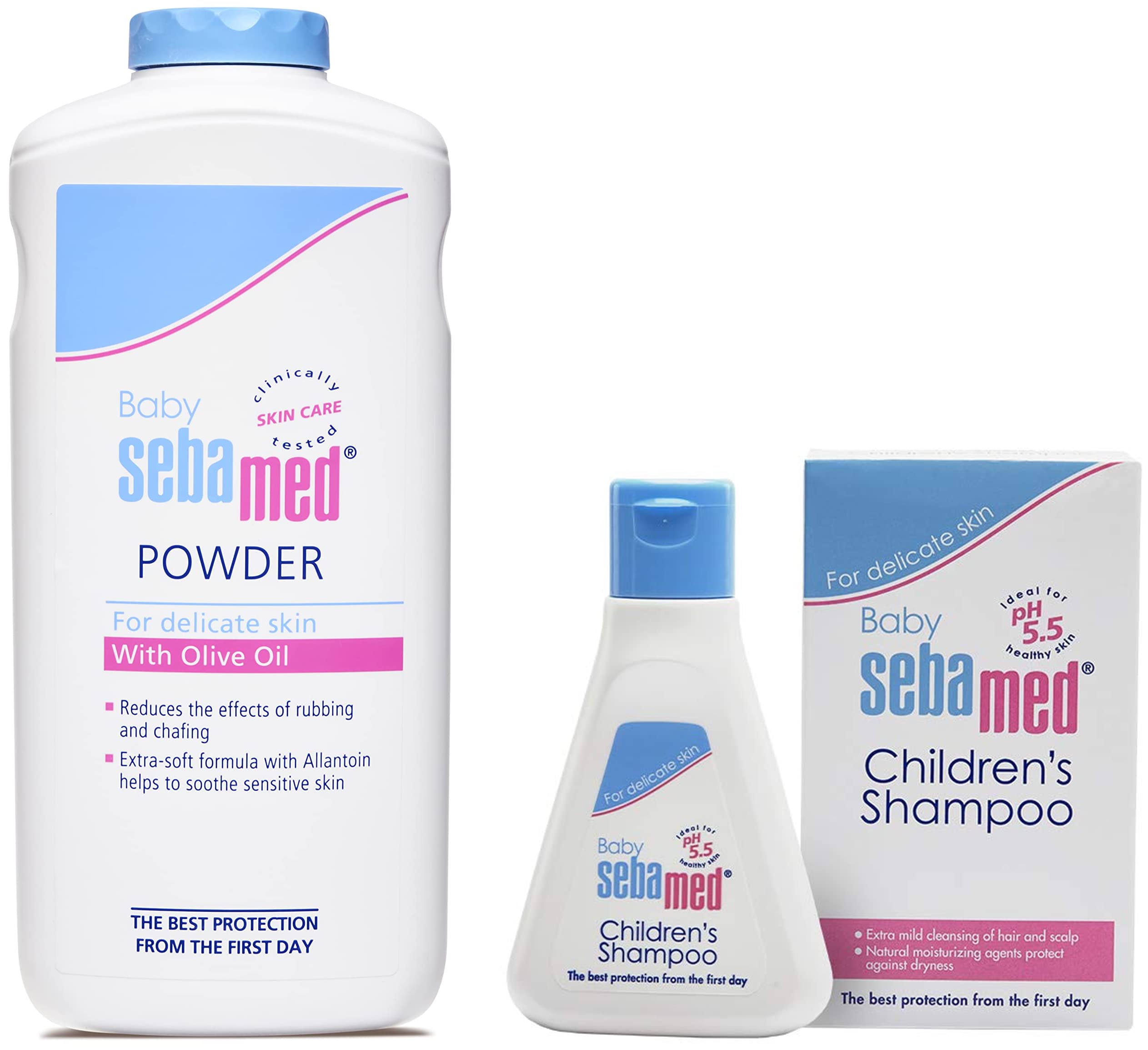Sebamed Baby Powder 200gMicronized form of tio2 reduces the effect of rubbing and chafing. Absorbs extra moisture from baby's skin to help skin feel comfortable. Extra soft formula with Allentown helps in protecting baby's delicate skin against irritation. Olive oil present in seamed baby powder soothes and protects baby's skin from dryness. Made in Germany olive oil soothes and protects the baby's skin from dryness allantoin makes the skin soft and smooth pleasant botanical fragrance ideal from one month onwards0 percent irritant reactions and almost 0 percent allergic reactions.Sebamed Childrenâs Shampoo (50ml)Sebamed children's shampoo has ph of 5. 5 And has sugar based mild cleanser. Other children shampoos have ph greater 7 and chemicals like formaldehyde phthalates sls which leads to allergic reactions. At ph 5. 5 Alone the scalp barrier remains intact. It has been clinically proven that only at ph 5. 5 Scalp is hydrated and strengthens scalp for optimal hair growth. Lipid and moisture loss is minimum and the growth of malassezia which leads to dandruff is restricted. Sebamed children's shampoo is free from irritants and hence has 0 percent incidences of irritant reactions. Sebamed children's shampoo contains botanical ingredient hence the reported incidence of allergic reaction is 0. 000003 Percent. Only at ph5. 5 The baby's delicate eyes are not irritated and the tear free formula is free from formaldehyde. Sebamed children's shampoo is ideal for cradle cap seborrheic dermatitis and dandruff. Made in germany100 percent soap and alkali free especially mild cleansers for gentle cleansing without irritating the scalp or hair herbal extract of chamomile alleviates irritation and soothes the skin special âno tearsâ formula does not sting in the eyes leaves hair fragrant and silky pleasant botanical fragrance ideal from six month onwards clinically proven suitability for cleansing of hair and scalp in babies and infants with sensitive scalp was proven in the dermatological study. Users documented an excellent acceptance of the shampoo and 93 percent were willing to continue using it.