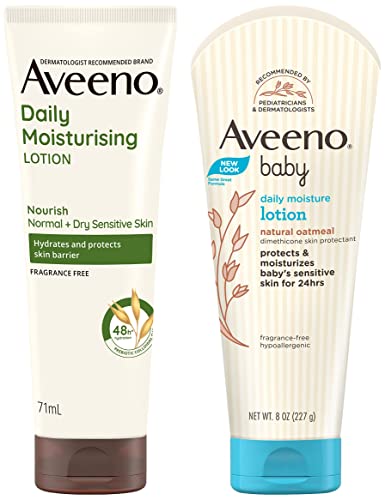 Aveeno Baby Daily Moisturising Lotion for Delicate Skin (227g)AVEENO Baby Daily Moisture Lotions ACTIVE NATURAL Oats formula contains 5 vital elements also found naturally in healthy skin. These elements soothe and help protect your baby's skin. The naturally nourishing non-greasy formula absorbs quickly moisturises for a full 24 hours contains no drying alcohols and won't clog pores. Its formulated to be hypoallergenic fragrance-free and gentle enough for daily use even on a new-borns delicate skin. AVEENO uses select natural ingredients because of their advanced benefits. These are called ACTIVE NATURALS natural ingredients uniquely formulated to deliver visible results. Scientists at AVEENO follow highest standards of ingredient selection formulation and manufacturing with processes that retain the strength and purity of such ingredients. Carefully extracted from the oat kernel ACTIVE NATURAL Oat Extract contain 5 vital ingredients also found naturally in healthy baby skin. These ingredients like proteins lipids enzymes vitamins and anti-oxidants provide a soothing effect while deeply nourishing delicate baby skin. INGREDIENT: Active Ingredient: Dimethicone 1.2% Purpose: Skin Protectant Inactive Ingredients: Water glycerin distearyldimonium chloride petrolatum isopropyl palmitate cetyl alcohol avena sativa (oat) kernel flour benzyl alcohol allantoin sodium chloride.Aveeno Daily Moisturising Lotion 71 mlAveeno daily moisturizing lotion is clinically proven to improve the health of dry skin in 1 day with significant improvement in 2 weeks. Formulated with active naturals colloidal oatmeal and rich emollients this nourishing lotion helps prevent and protect dry skin for a full 24 hours. As a skin protectant active ingredient oatmeal can help restore skin's normal ph. and aid in the maintenance of skin's moisture barrier to help prevent and protect dry skin. Aveeno daily moisturising lotion leaves your skin feeling soft smooth and naturally healthy looking and is gentle enough for everyday use. Its also fragrance free non-greasy and non-comedogenic. From humble beginnings in 1945 the story of the Aveeno brand has been one of discovery. By unlocking natures powers through scientific advances they have discovered ways to nurture and transform skin and hair to an enhanced state of natural health and beauty. Aveeno uses select natural ingredients because of their advanced benefits. These are called active naturals natural ingredients uniquely formulated to deliver visible results. Scientists at Aveeno follow highest standards of ingredient selection formulation and manufacturing with processes that retain the strength and purity of such ingredients.