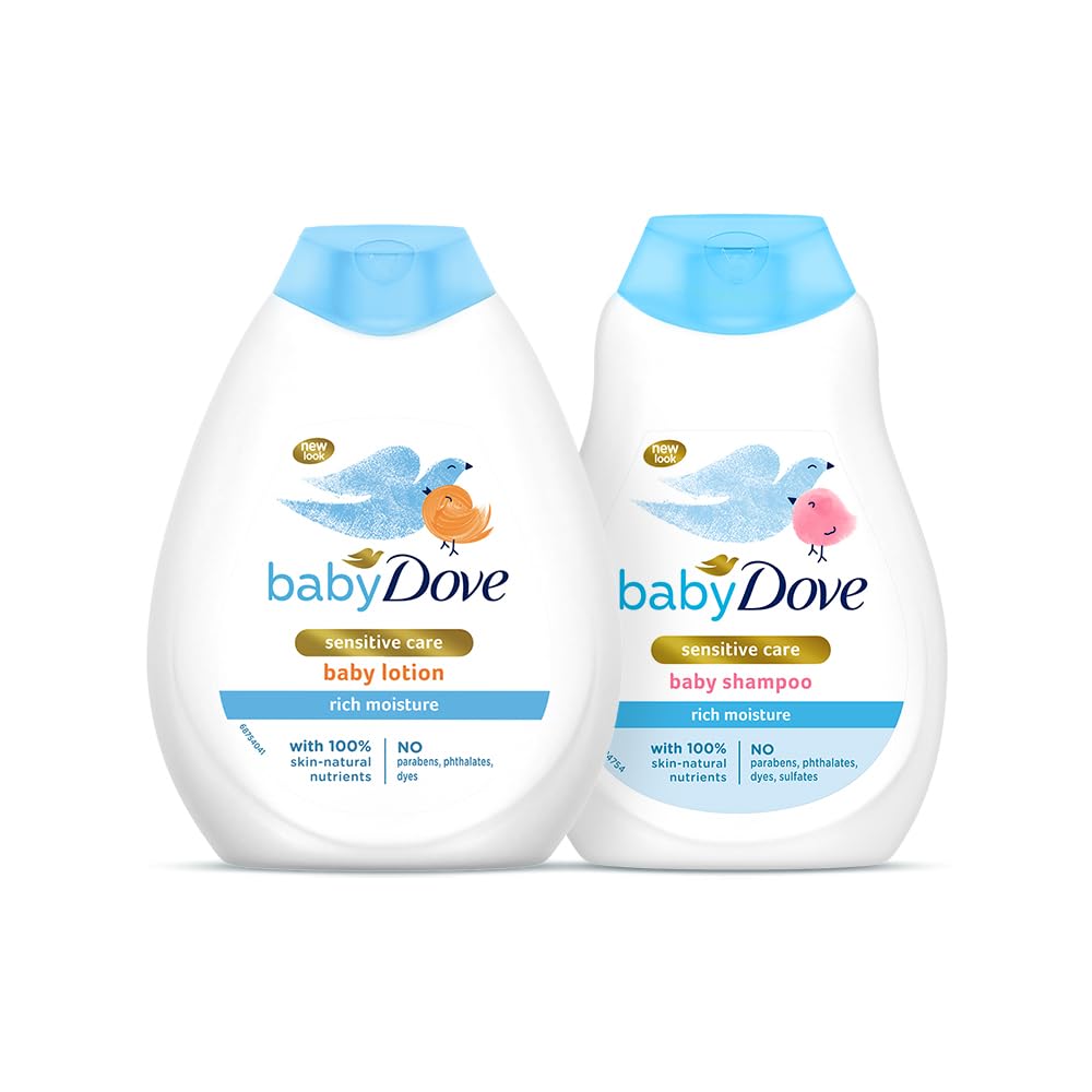 Baby skin is delicate and can lose essential nutrients 5 times faster during bath time than adults. To keep your baby skin soft and nourished|| we created Baby Dove Rich Moisture Baby Lotion. Soothing dry skin from the very first use|| this caring baby moisturizer replenishes skin-essential nutrients to help baby skin retain its natural moisture. Made with prebiotic moisturizer and 100% skin-natural nutrients*|| this baby lotion is designed to nourish your baby microbiome the living layer that protects your baby skin. The microbiome plays an important role in keeping your baby skin resilient and healthy looking after it is a beautifully simple way to care for your baby. With a comforting scent|| the rich|| gentle formula of this baby lotion offers long-lasting moisturization. Paediatrician|| our cream for baby's delicate skin will be a helping hand in your routine. Why choose Baby Dove? 100% skin-natural nutrients* nourish your baby skin Hypoallergenic baby lotion soothes dry skin from the first use Formulated with prebiotic moisturizer to support baby skin natural health Free from dyes|| parabens|| phthalates and sulphates. pH neutral to baby skin Mild fragrance specially developed for babies Paediatrician approved|| safe for new-born. *Our nutrients are identical to those naturally found in skin*OLD It not just the skin on your baby body that needs special care did you know that the scalp is one of their most sensitive areas and means it loses moisture up to 5 times faster after every bath! With a rich|| creamy lather|| Baby Dove Rich Moisture Shampoo is specially designed to give your baby the sensitive skin and hair care they deserve. Proven to be as gentle as water|| it delicately cleanses your baby hair without irritating their skin. Made with prebiotic moisturizer and 100% skin-natural nutrients*|| our no tears shampoo replenishes the scalp with skin-essential nutrients and leaves hair soft and healthy looking. Paediatrician-tested|| this shampoo for newborn babies is free from dyes|| parabens|| phthalates and sulphates. With hypoallergenic|| mild cleansers|| you can gently cleanse your baby's hair. Why choose Baby Dove? 100% skin-natural nutrients* help your baby scalp retain natural moisture Tear-free & pH neutral to baby skin Formulated with ¼ moisturizing cream. Made with a hypoallergenic formula that as gentle as water your new-born first bath. Made with prebiotic moisturizer to support baby skin natural health Free from dyes|| parabens|| phthalates and sulphates. Caring baby shampoo infused with a delicate|| comforting scent Paediatrician approved|| safe for new-born. Made from 100% recyclable plastic Certified cruelty-free by PETA *Our nutrients are identical to those naturally found in skin*OLD