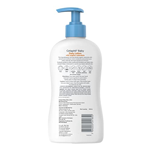 Cetaphil Baby Daily Lotion contains a blend of organic calendula extract almond oil and sunflower oil. It is gentle enough to moisturize and protect even the most delicate skin from dryness. Ingredients Water Sorbitol Helianthus Annuus (Sunflower) Seed Oil Isopropyl Palmitate Octyldodecanol Polyglyceryl 3 Diisostearate Glycerin Panthenol (Vitamin B5) Hexyldecanol Hexyldecyl Laurate Prunus Amygdalus Dulcis (Sweet Almond) Oil Caprylyl Glycol Carbomer Fragrance Disodium Cocoyl Glutamate Sodium Hydroxide Dipropylene Glycol Calendula Officinalis Flower Extract Squalane Propylene Glycol Glyceryl Caprylate Heliotropine Tocopherol (Vitamin E) Glycine Soja (Soybean) Oil.