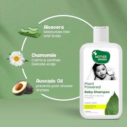 • NOURISHING & GENTLE: The gentle plant-derived formula of Mother Sparsh baby shampoo has Vitamin-E oil which helps in hair growth & Aloe Vera which has a mild cleansing action and soothes your baby's fragile scalp. The delicate formula effectively removes
