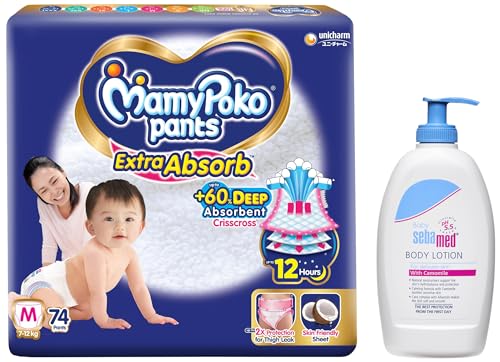 Sebamed Baby Body Lotion 400 ml, Ph 5.5 & MamyPoko Pants Extra Absorb Baby Diapers, Medium (M), 74 Count, 7-12kg