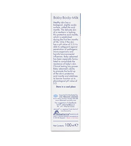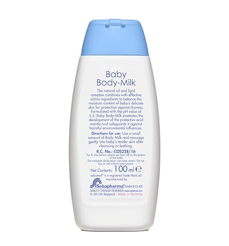 For babies and small children skin lotion is not a luxury! Babies and young children do not have a fully developed barrier function to protect against harmful environmental factors. The sebum production is lower than in adults. Therefore applying a moisturizer after washing or bathing provides essential support for the bodyâs protective functions. Baby Body-Milk contains valuable vegetal oils and lipids. The natural moisturizers such as lecithin almond oil shea butter and squalene provide optimal protection against dehydration and are very well tolerated. 1) 22% natural lipids in an oil-in-water emulsion 2) Sweet Almond Oil Shea Butter Squalane and Lecithin safeguard against dryness 3) Allantoin makes the skin smooth and supple 4) Spreads easily and is rapidly absorbed 5) Free from mineral oils 6) Free from PEG bonds 7) pH value of 5.5 supports the development of babyâs acid mantle