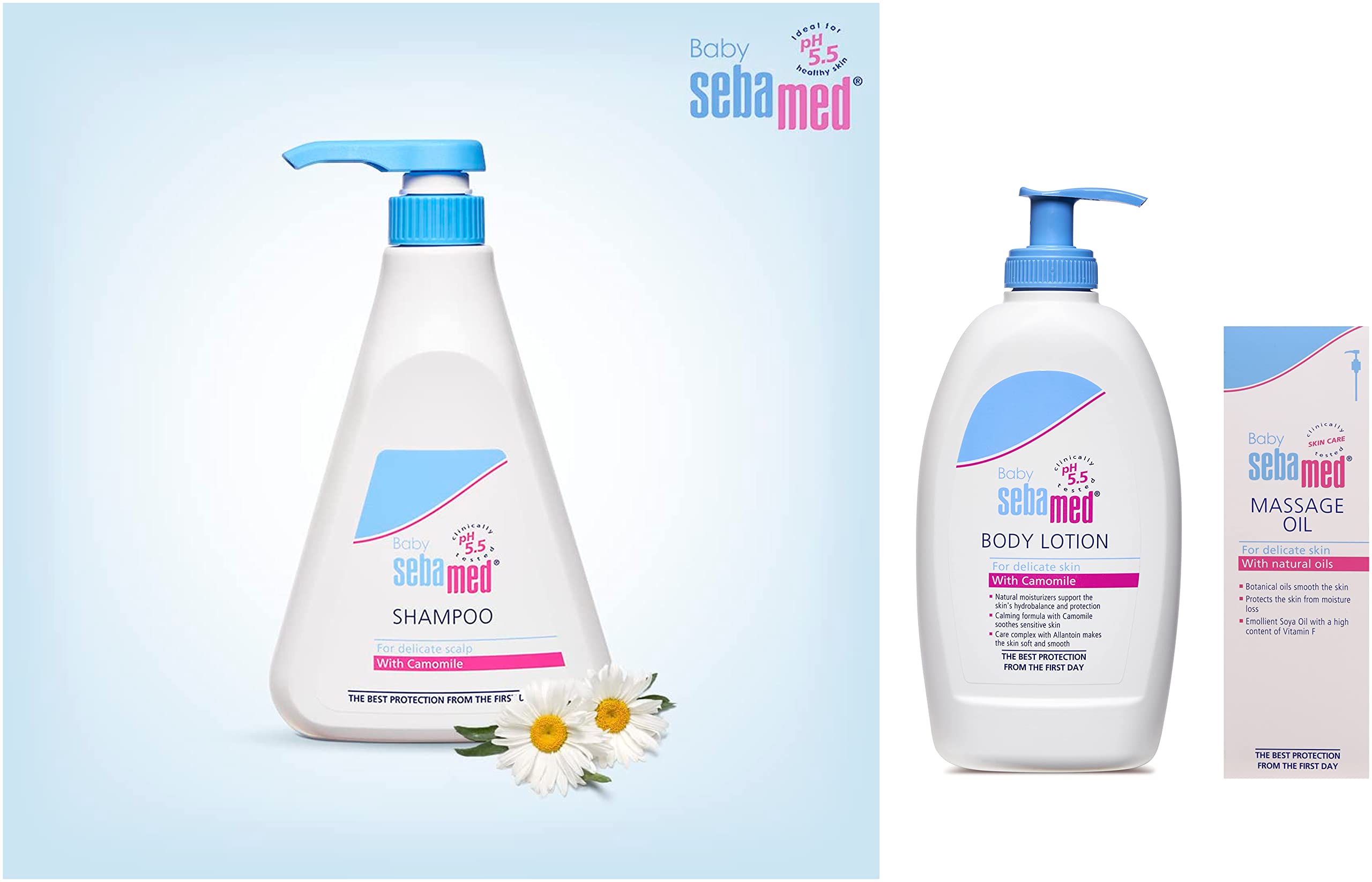 Sebamed Baby Lotion 400mlSeamed baby lotion has a ph of 5. 5 And contain natural lipids. Conventional baby lotions have ph greater 7 and contains parabens and propylene glycol which can cause burning sensation and skin irritation. Seamed baby lotion contains 7 percent natural lipids plus lecithin plus sorbitol ensures long lasting hydration. Sebamed baby lotion has easy spread ability without leaving an oily film. Made in Germany gentle protection for delicate baby skin moisturizing and emollient complex safeguard against dryness allantoin makes the skin smooth and supple chamomile soothes the skin rapidly absorbed without greasy residue7 percent lipid compound oil in water emulsion supports the natural lipid balance pleasant botanical fragrance ideal from 7 day onwards clinically proven 16 percent increase in skin hydration within 3 weeks.Sebamed Childrens' Shampoo 500mlSebamed children's shampoo has ph of 5. 5 And has sugar based mild cleanser. Other children shampoos have ph greater 7 and chemicals like formaldehyde phthalates sls which leads to allergic reactions. At ph 5. 5 Alone the scalp barrier remains intact. It has been clinically proven that only at ph 5. 5 Scalp is hydrated and strengthens scalp for optimal hair growth. Lipid and moisture loss is minimum and the growth of malassezia which leads to dandruff is restricted. Sebamed children's shampoo is free from irritants and hence has 0 percent incidences of irritant reactions. Sebamed children's shampoo contains botanical ingredient hence the reported incidence of allergic reaction is 0. 000003 Percent. Only at ph5. 5 The baby's delicate eyes are not irritated and the tear free formula is free from formaldehyde. Sebamed children's shampoo is ideal for cradle cap seborrheic dermatitis and dandruff. Made in germany100 percent soap and alkali free especially mild cleansers for gentle cleansing without irritating the scalp or hair herbal extract of chamomile alleviates irritation and soothes the skin special âno tearsâ formula does not sting in the eyes leaves hair fragrant and silky pleasant botanical fragrance ideal from six month onwards clinically proven suitability for cleansing of hair and scalp in babies and infants with sensitive scalp was proven in the dermatological study. Users documented an excellent acceptance of the shampoo and 93 percent were willing to continue using it.Sebamed Baby Massage Oil 150ml100 Percent botanical non sticky massage oil. Superior spread ability and faster absorption. Conventional massage oils contain mineral oil colorants and other irritants which can cause allergic reactions. Sebamed soothing massage oil contains 95 percent soy oil contains essential fatty acids which ensures superior hydration. 5 Percent wheat germ oil is the richest source of vitamin e. Sebamed soothing massage oil does not solidify at lower temperature made in Germany gentle care and protection of babyâs sensitive skin emollient with 95 percent natural soya oils high content of formula with vitamin f a soya oil compound insures high skin tolerability gentle protection for delicate baby skin ideal from day 7 2 years0 percent irritant reactions and almost 0 percent allergic reactions.Gentle Care and Protection for Your Baby's Skin The Sebamed baby massage oil is perfect for taking gentle care and protecting your baby's sensitive skin. As your baby's skin is extremely tender it is vulnerable to hot and cold weather as well as skin problems like dry skin and diaper rash. This oil acts as an emollient soothing and softening your little one's skin and is made of 95% natural soya oils. You can strengthen and increase your baby's skin tolerability as this Sebamed massage oil contains a high content of Vitamin F which is a soya oil compound.Provides Wide Reaching Benefits With this baby massage oil you can protect your baby's skin from harmful effects and also help in stimulating the blood circulation and developing the digestive and neurological system of your baby. Pain caused due to gas teething and illnesses are very distressing for children. The massage oil for baby from Sebamed helps to relieve such painful occurrences. As it is non-greasy this massage oil is also easy to apply and doesn't leave a sticky feeling on your hands. Massaging also helps to enhance the emotional well-being between you and your baby. Brand: Sebamed Soya oil with high content of Vitamin F Emollient featuring 95% natural soya oils Relieve pain of colic gas illness and teething Non-greasy Includes detailed body massage guide Content: 150ml /div