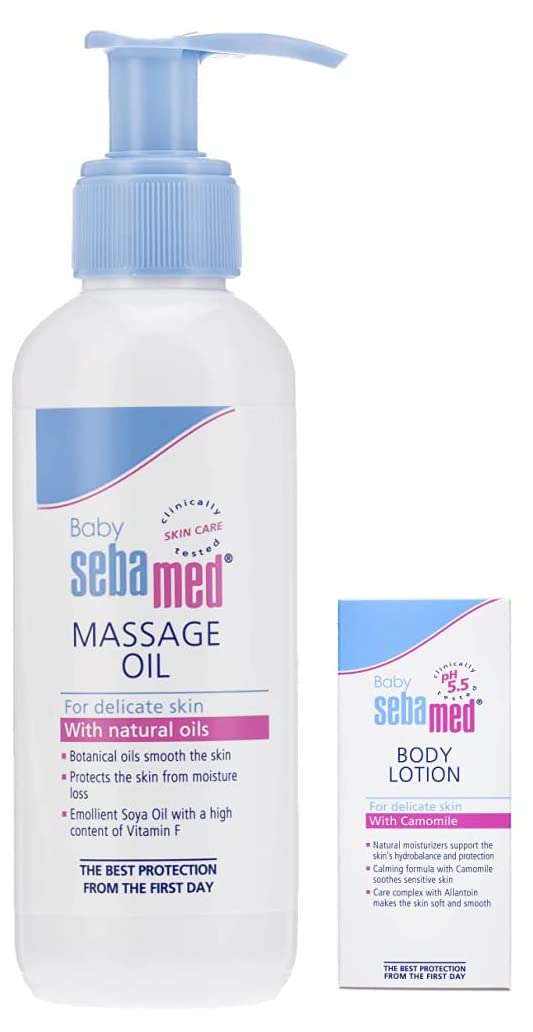 Sebamed Baby Massage Oil 150ml100 Percent botanical non sticky massage oil. Superior spread ability and faster absorption. Conventional massage oils contain mineral oil colorants and other irritants which can cause allergic reactions. Sebamed soothing massage oil contains 95 percent soy oil contains essential fatty acids which ensures superior hydration. 5 Percent wheat germ oil is the richest source of vitamin e. Sebamed soothing massage oil does not solidify at lower temperature made in Germany gentle care and protection of babyâs sensitive skin emollient with 95 percent natural soya oils high content of formula with vitamin f a soya oil compound insures high skin tolerability gentle protection for delicate baby skin ideal from day 7 2 years0 percent irritant reactions and almost 0 percent allergic reactions.Sebamed Baby Lotion 100mldiv class="aplus"pIt is very important to keep a babyâs skin clean and moisturised. There are several baby care products that contain harsh chemicals and using these on his/her delicate skin can be harmful for such soft and sensitive skin. Babies should therefore be treated with utmost care and maintaining cleanliness is a must to maintain his/her health and growth. Sebamed body oil is ideal for infants from 0 to 10 years. It is so mild and soft that it can be used to clean the baby as soon as the umbilical cord is cut. Babies tend to develop skin problems like irritation itchiness dryness rashes and redness in no time. bSebamed oil/b is therefore a perfect solution to all such skin complications./p pbSebamed Baby Lotion/b keeps the skin soft and well moisturised in all weather conditions. Regular application keeps your babyâs skin healthy and glowing. In fact it works wonders for kids suffering from neurodermatitis. It has sugar tensed complex that moisturises the skin deep within thereby giving it a complete cover and shine. The lotion is free from skin alkali dioxin and paraben so that the sensitive skin of your little one doesnât fall prey to side effects. It absorbs within the skin cells thereby leading to a non-greasy and dry skin./p pThe Sebamed oil can be used many times in a day since you are required to constantly change the diapers in order to keep the bottom area of the baby clean and moisturised. Changing diapers leads to redness and pimples that keep babies uncomfortable throughout the day. bSebamed/b oil can therefore score high in this context since it has healing properties 100% soap-free and clinically tested.. Moreover it comes in a 100ml bottle which is sufficient enough to go for a month. So if you have been looking for a baby oil this is surely going to prove worthy for your babyâs sensitive skin./p/div