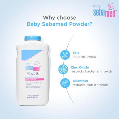 Micronized form of tio2 reduces the effect of rubbing and chafing. Absorbs extra moisture from baby's skin to help skin feel comfortable. Extra soft formula with Allentown helps in protecting baby's delicate skin against irritation. Olive oil present in seamed baby powder soothes and protects baby's skin from dryness. Made in Germany olive oil soothes and protects the baby's skin from dryness allantoin makes the skin soft and smooth pleasant botanical fragrance ideal from one month onwards0 percent irritant reactions and almost 0 percent allergic reactions.