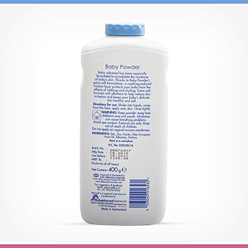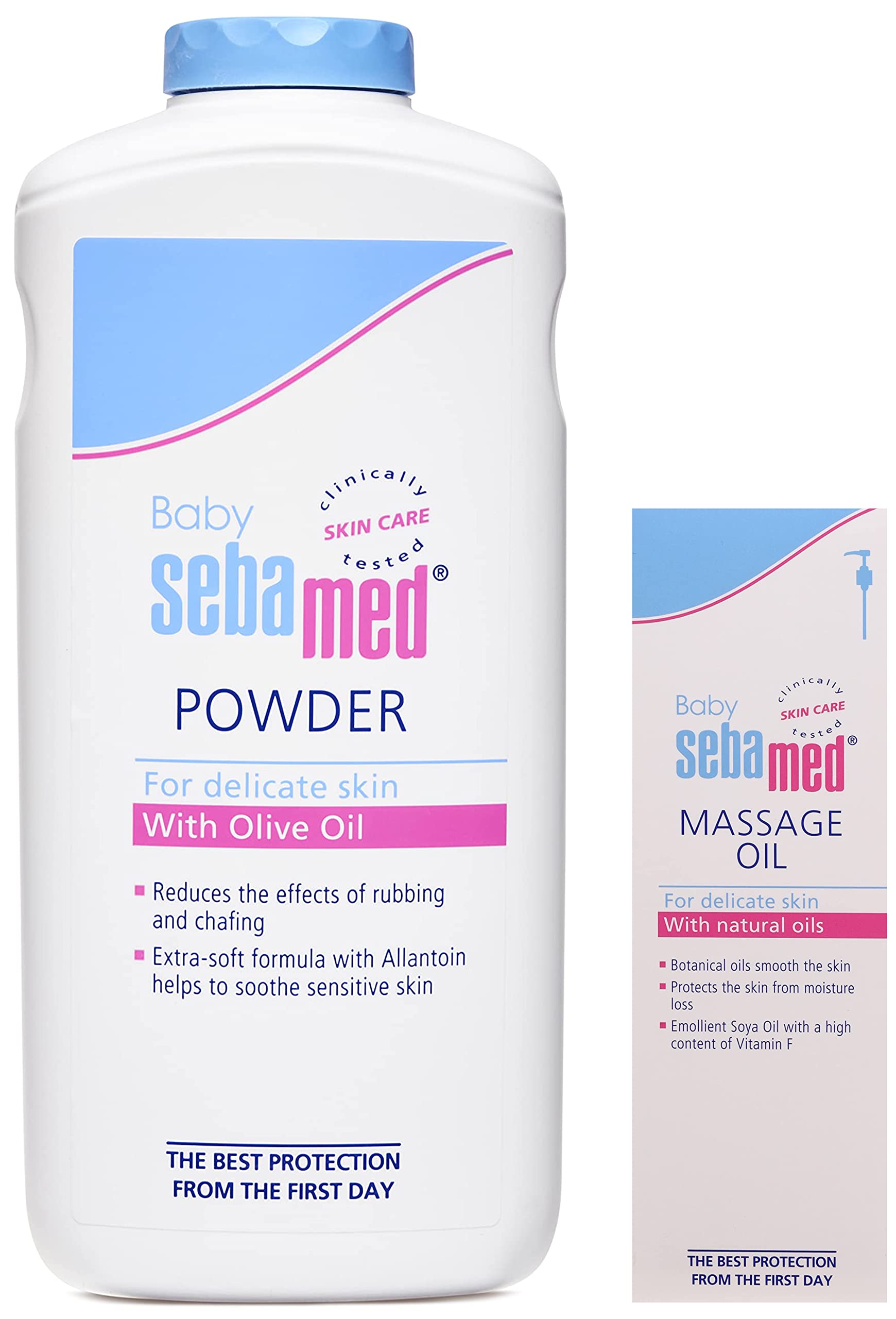 Sebamed Baby Powder 400gMicronized form of tio2 reduces the effect of rubbing and chafing. Absorbs extra moisture from baby's skin to help skin feel comfortable. Extra soft formula with Allentown helps in protecting baby's delicate skin against irritation. Olive oil present in seamed baby powder soothes and protects baby's skin from dryness. Made in Germany olive oil soothes and protects the baby's skin from dryness allantoin makes the skin soft and smooth pleasant botanical fragrance ideal from one month onwards0 percent irritant reactions and almost 0 percent allergic reactions.Sebamed Baby Massage Oil 150ml100 Percent botanical non sticky massage oil. Superior spread ability and faster absorption. Conventional massage oils contain mineral oil colorants and other irritants which can cause allergic reactions. Sebamed soothing massage oil contains 95 percent soy oil contains essential fatty acids which ensures superior hydration. 5 Percent wheat germ oil is the richest source of vitamin e. Sebamed soothing massage oil does not solidify at lower temperature made in Germany gentle care and protection of babyâs sensitive skin emollient with 95 percent natural soya oils high content of formula with vitamin f a soya oil compound insures high skin tolerability gentle protection for delicate baby skin ideal from day 7 2 years0 percent irritant reactions and almost 0 percent allergic reactions.