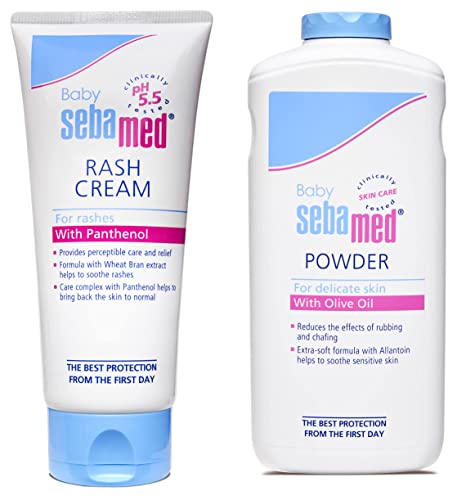 Sebamed Baby Powder 200gMicronized form of tio2 reduces the effect of rubbing and chafing. Absorbs extra moisture from baby's skin to help skin feel comfortable. Extra soft formula with Allentown helps in protecting baby's delicate skin against irritation. Olive oil present in seamed baby powder soothes and protects baby's skin from dryness. Made in Germany olive oil soothes and protects the baby's skin from dryness allantoin makes the skin soft and smooth pleasant botanical fragrance ideal from one month onwards0 percent irritant reactions and almost 0 percent allergic reactions.Sebamed Baby Rash Cream 100mlSebamed rash cream contains micronized form of Titanium dioxide which forms physical barrier over skin. pH 5.5 + micronized form of Titanium dioxide ensures faster recovery as compared to conventional rash creams which contain zinc oxide and pH 7. The high panthenol content promotes skin regeneration and the healing of damaged skin. Natural bees wax + squalene + sorbitol ensures optimal hydration of baby's skin.