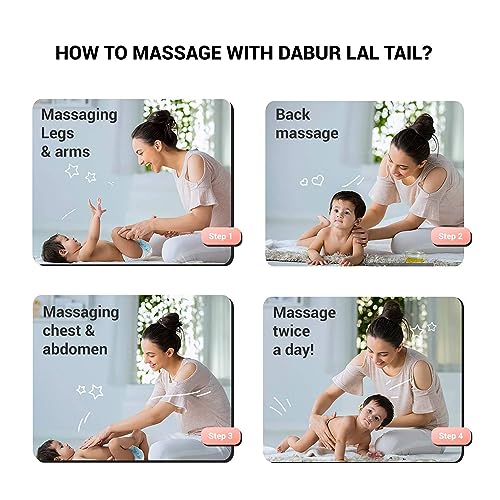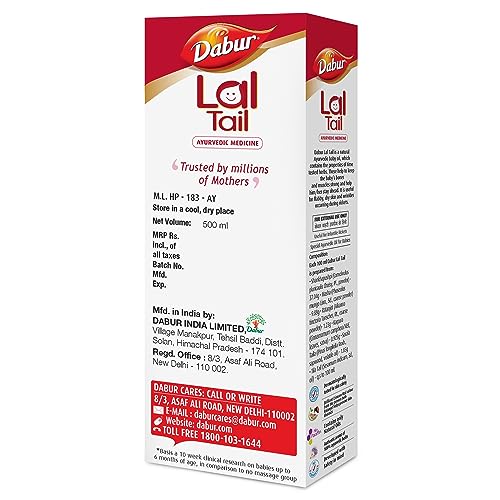 Dabur Lal Tail is a specially crafted Ayurvedic baby massage oil made with time tested ingredients that have many proven benefits for babies Dabur Lal Tail contains Ratyanjot which helps protect the baby’s skin camphor which helps with blood circulation Shankhpushpi which is good for skin health and in weakness and Urad which nourishes muscles and bones Regular massage with Dabur Lal Tail also helps relieve colic and other digestive problems improves sleep patterns of your little one and stimulates blood circulation