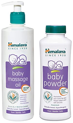 Himalaya Baby Powder (400g)pGentle Cool and CalmingEnriched with natural ingredients the Himalaya Herbals baby powder is highly efficacious in combating baby's dry skin problems. This herbal baby powder is enriched with nourishing elements like olive oil almond oil khus khus and natural zinc that effectively soothe your baby's delicate skin. Olive oil has the goodness of Vitamin E and is known to soften and protect your child's skin while preventing dermatitis and other skin problems like chaffing. Vitamin A-enriched almond oil fights infections and contributes to significant bone development of your infant. Apart form its soothing and anti-microbial properties it keeps your newborn's delicate and sensitive skin shielded from environmental pollutants that cause irritation. Khus Khus is another natural ingredient that has strong anti-perspirant and astringent properties.Healing Properties for Sensitive Skin The antiseptic and healing powers of natural zinc found in this 400g herbal baby powder are quite effective against conditions like Hyperhidrosis (excessive sweating) and Miliaria Rubra (commonly known as prickly heat). As the functioning of sweat glands is not developed to the fullest in infants they are prone to sweat-related irritation rashes and blisters. The Himalaya baby powder is clinically found to be effective in treating all such dermatological problems. Apply a liberal quantity of the powder to delicate areas like face knees elbows and skin folds where the chances of infection are high. Buy Himalaya baby powder to protect and nourish your toddler's skin and make it smell great all through an active day.Product FeaturesIdeal for: Dry and itchy skin dermatitis excessive sweating and prickly heatAge: Newborn and upContains: Natural zinc olive oil khus khus and almond oil for overnight relief from rashes and eliminating drynessHypoallergenicPaediatrician recommendedContent: 400gHimalaya Baby Massage Oil (500ml)Enriched with olive oil and winter cherry acetate Himalaya's baby massage oil is clinically proven to be mild enough to use on babies. It is a light nonstaining oil that can be used before bathing as a massage oil and for moisturizing after bathing. Daily massage has been shown to benefit baby's overall growth and development.