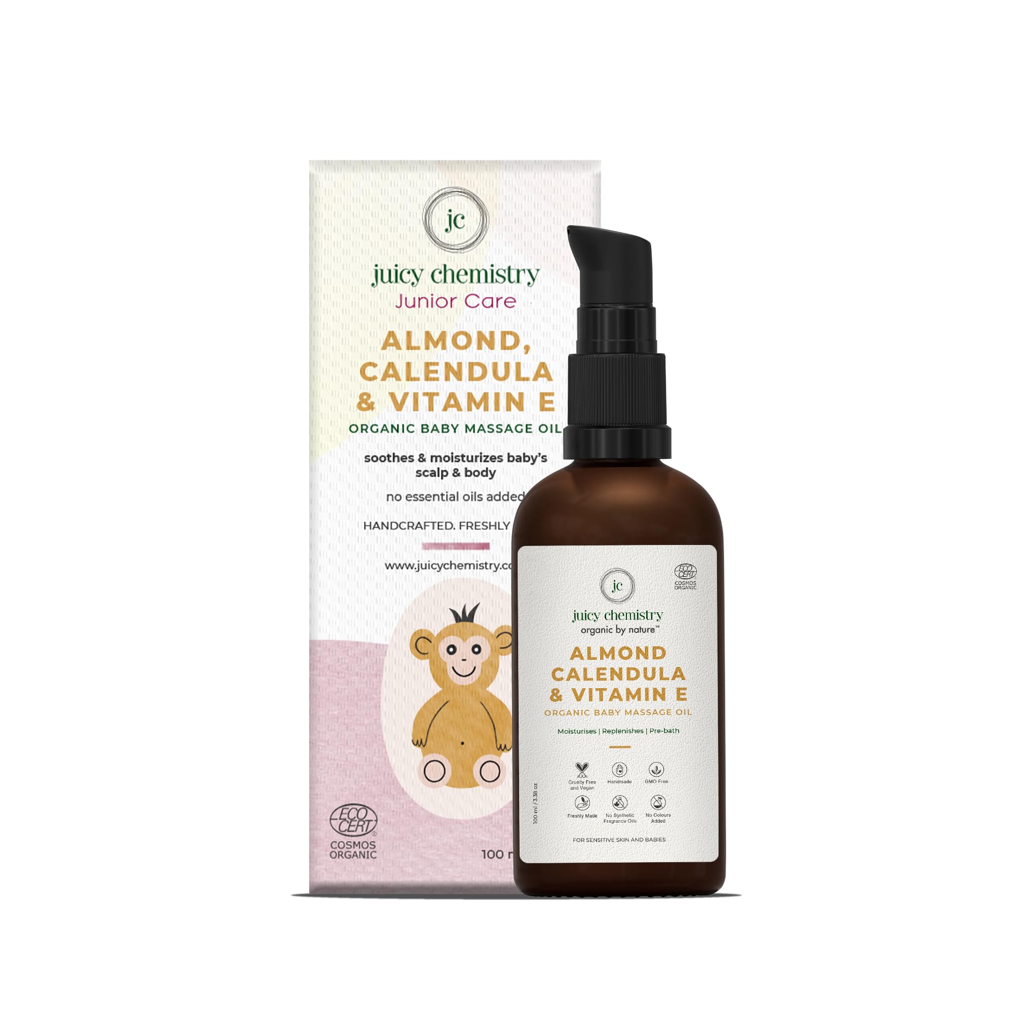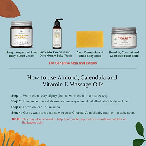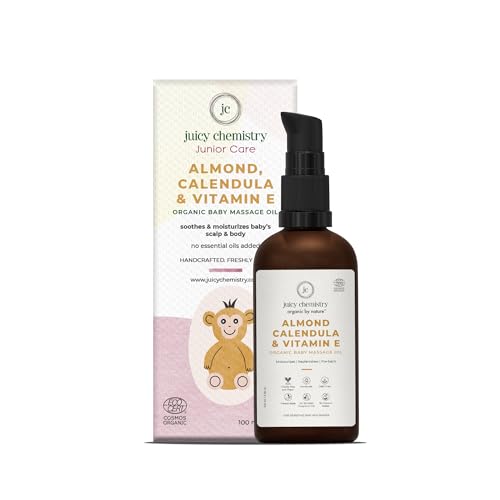 HomeBabyBath & SkinBaby Skin CareMassage OilJuicy Chemistry Almond, Calendula & Vitamin E Baby Massage Oil,100ml, Certified Organic Baby Body Oil for Scalp and Body Massage Suitable for New Born Baby & Sensitive Skin