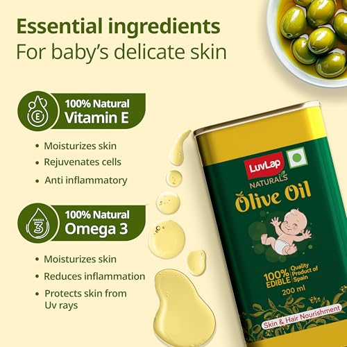 • LuvLap Naturals baby body massage oil contanis 100% edible Olive oil extracted from Spanish Olive that enhances your baby's bone & muscle strength stimulate blood circulation.