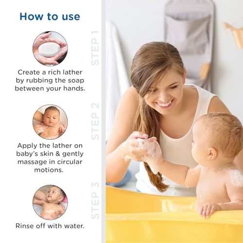 RETAINS MOISTURE: Enriched with natural ingredients like Chamomile Olive Almond Oil and Milk Extracts ensuring gentle care for your baby's delicate skin. The soap nourishes and moisturizes the skin after every bath. It keeps the skin pH balanced and preve