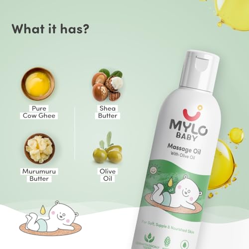 • MOISTURIZES & NOURISHES SKIN: Mylo Baby Massage Oil contains ingredients such as shea butter and olive oil that are known to provide long lasting hydration to the skin.