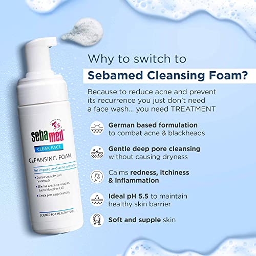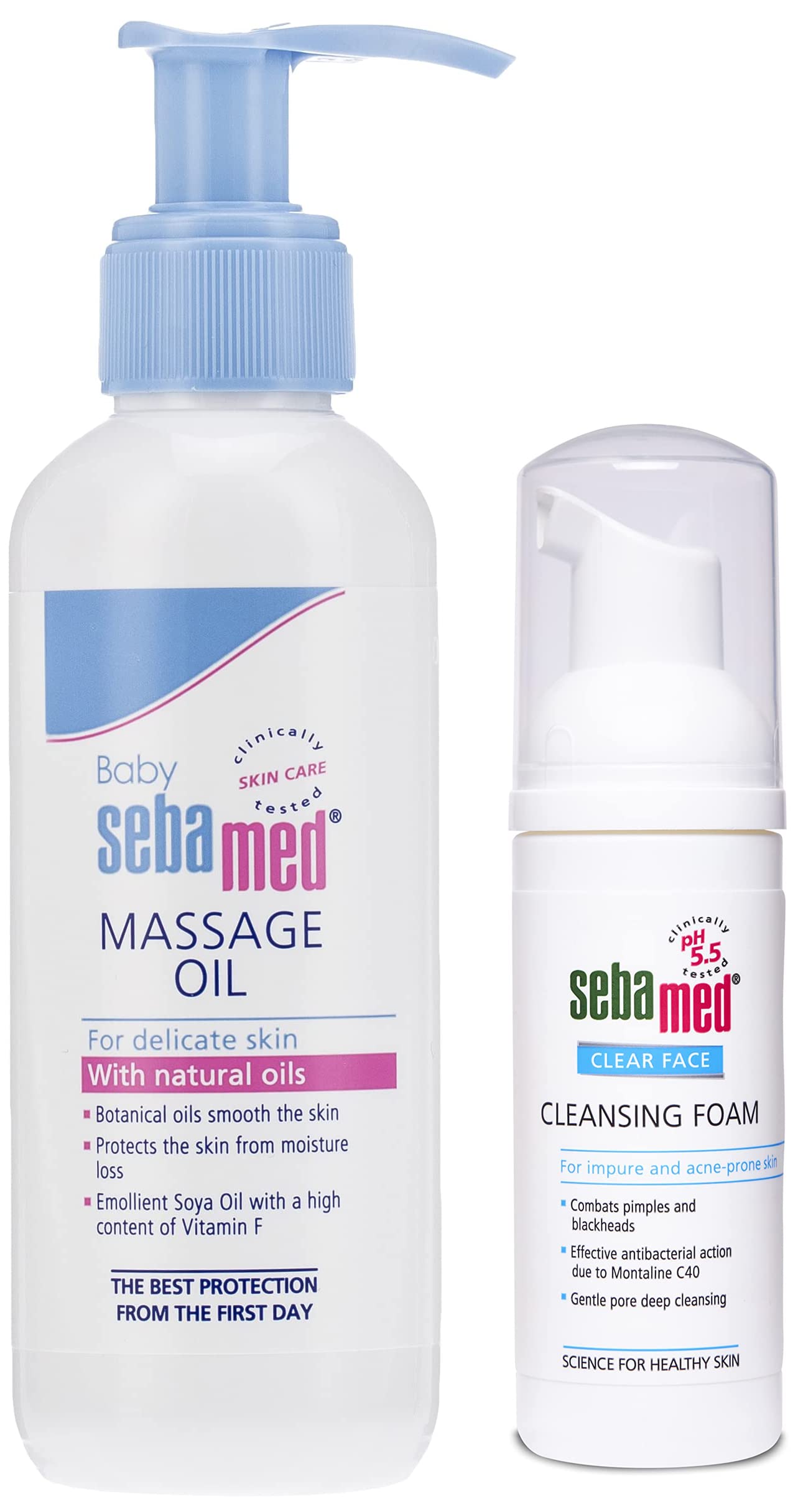 Sebamed Baby Massage Oil 150ml100 Percent botanical non sticky massage oil. Superior spread ability and faster absorption. Conventional massage oils contain mineral oil colorants and other irritants which can cause allergic reactions. Sebamed soothing massage oil contains 95 percent soy oil contains essential fatty acids which ensures superior hydration. 5 Percent wheat germ oil is the richest source of vitamin e. Sebamed soothing massage oil does not solidify at lower temperature made in Germany gentle care and protection of baby sensitive skin emollient with 95 percent natural soya oils high content of formula with vitamin f a soya oil compound insures high skin tolerability gentle protection for delicate baby skin ideal from day 7 2 years0 percent irritant reactions and almost 0 percent allergic reactions.Sebamed Clear Face Foam 50mlSebamed clear face cleansing foam fights pimples and supports healthy facial skin. Great as a daily cleanser as it is ultra-hydrating without draining your skin of moisture. The refreshing foam gently removes oil while the special formula fights pimple-causing bacteria without making your face red or shiny. Sebamed clear face cleansing foam ensures the gentle and effective deep cleansing of the pores to combat pimples blackheads and skin impurities. Sebamed clear face cleansing foam contains mild soap and alkali free wash active substance removes excessive sebum desquamation and dirt particles without drying the skin. The new active ingredient montaline c40 combats bacteria - reduces bacteria count from 1 lac to 0 in 5 minutes and helps to prevent the formation of new pimples. Vitamin b5 supports the natural regeneration of irritated skin. Sebamed clear face cleansing foam is adjusted to the skin's natural ph value of 5. 5 Protecting and supporting the biological barrier function of the skin's acid mantle to help prevent new pimples from forming. Give your oily skin a feeling of freshness without drying it and help your acne to heal with our clear face cleansing foam. At ph 5. 5 The growth of acne causing bacteria is also minimum.