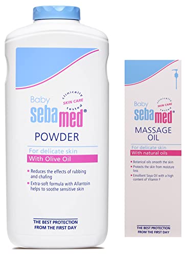 Sebamed Baby Powder 200gMicronized form of tio2 reduces the effect of rubbing and chafing. Absorbs extra moisture from baby's skin to help skin feel comfortable. Extra soft formula with Allentown helps in protecting baby's delicate skin against irritation. Olive oil present in seamed baby powder soothes and protects baby's skin from dryness. Made in Germany olive oil soothes and protects the baby's skin from dryness allantoin makes the skin soft and smooth pleasant botanical fragrance ideal from one month onwards0 percent irritant reactions and almost 0 percent allergic reactions.Sebamed Baby Massage Oil 150ml100 Percent botanical non sticky massage oil. Superior spread ability and faster absorption. Conventional massage oils contain mineral oil colorants and other irritants which can cause allergic reactions. Sebamed soothing massage oil contains 95 percent soy oil contains essential fatty acids which ensures superior hydration. 5 Percent wheat germ oil is the richest source of vitamin e. Sebamed soothing massage oil does not solidify at lower temperature made in Germany gentle care and protection of baby sensitive skin emollient with 95 percent natural soya oils high content of formula with vitamin f a soya oil compound insures high skin tolerability gentle protection for delicate baby skin ideal from day 7 2 years0 percent irritant reactions and almost 0 percent allergic reactions.