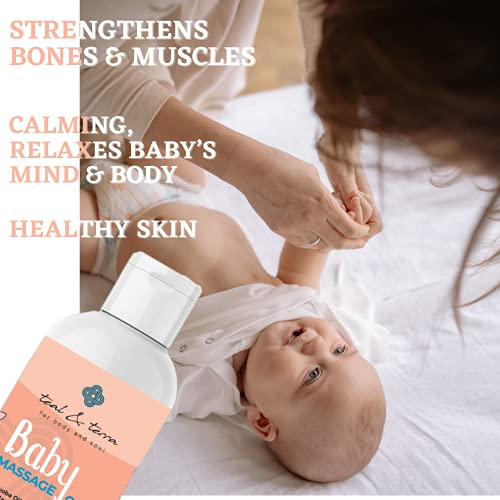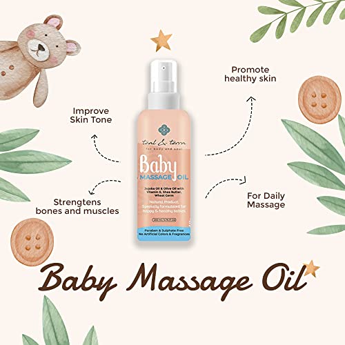 Massages that are healthy and loving are essential for a baby's growth. Choosing the correct blend of oils is essential for a child's growing muscles and bones. By massaging your child you can strengthen your bond with them. Use Teal & Terra's Baby Massage Oil to make it extra special. a blend of premium essential oils to effectively treat your baby's skin and achieve the greatest outcomes. The body is strengthened with olive oil so the baby's muscles are sturdy enough for aerobic activity. It contains wheatgerm oil a natural mood enhancer that eases body tension and promotes relaxation. Additionally it enhances sleep which makes kids happier and more rested! Without any additional chemicals or synthetic additives it is a completely natural oil. Benefits: improved bone density and muscles. healthy moisturised skin. enhances blood flow and sleep. improves the baby's temperament making it cheerful. prevents dry skin. prevents skin from getting sick supple soft skin.
