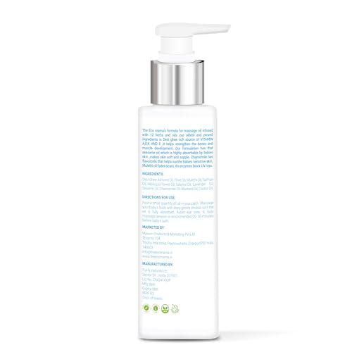 The Eco Mama Baby Massage Oil Infused with 12 Herbs Desi Ghee Mulethi Oil & Chamomile (200 ML)| Helps Strengthen Bones and Muscle Development Softens Baby Skin Blocks Dryness Itching & Irritation Calms & Comforts Baby | Suitable for all skin type