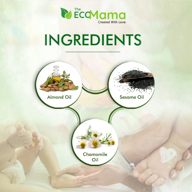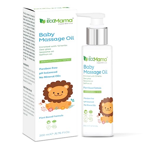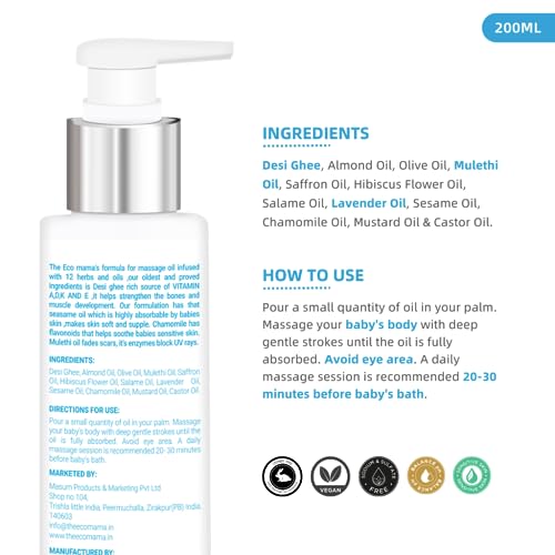 The Eco Mama Baby Massage Oil Infused with 12 Herbs, Desi Ghee, Mulethi Oil & Chamomile (200 ML)| Helps Strengthen Bones and Muscle Development, Softens Baby Skin, Blocks Dryness, Itching & Irritation, Calms & Comforts Baby | Suitable for all skin type