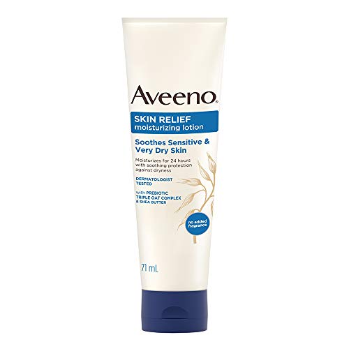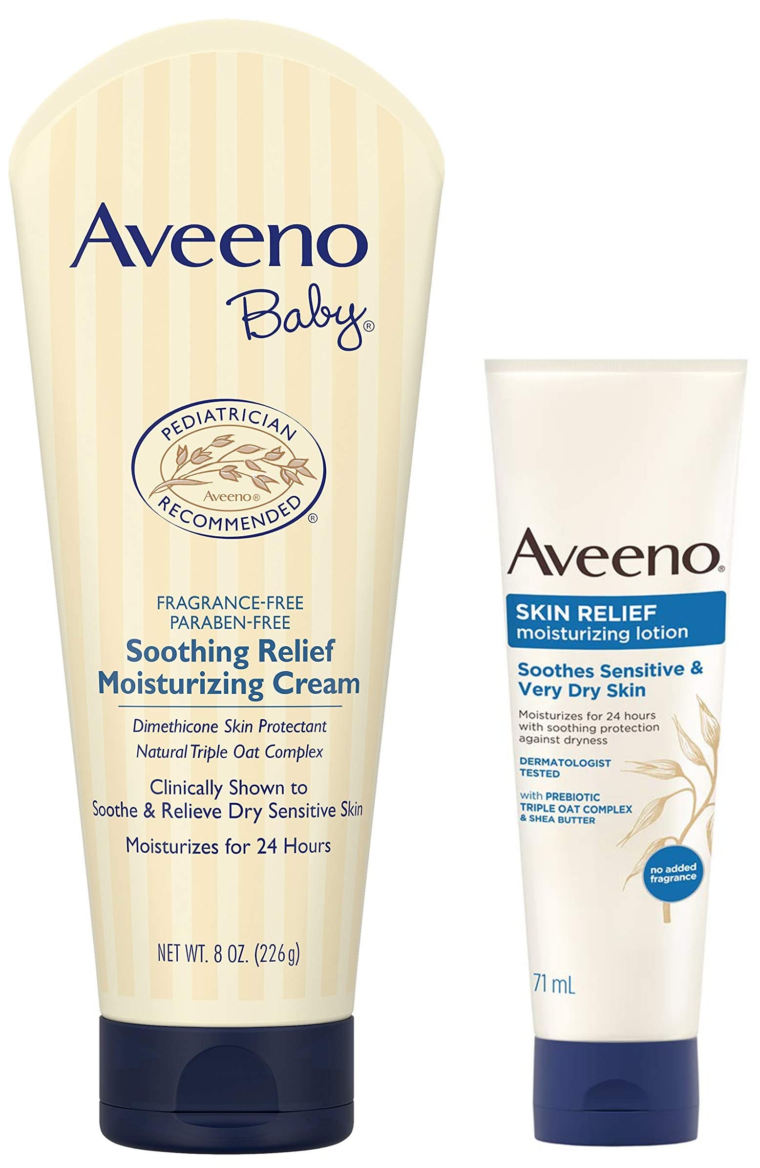 Aveeno Baby Soothing Relief Moisture Cream Fragrance Free 227gpAVEENO Baby Soothing Relief Moisture Cream contains ACTIVE NATURAL Colloidal Oats Formula and rich emollients that soothe dry irritable skin. Its clinically proven to moisturize for 24 hours and soothe dry skin. This formula absorbs quickly and is gentle enough newborns delicate skin as well. Its hypoallergenic and fragrance free./ppAVEENO uses select natural ingredients because of their advanced benefits. These are called ACTIVE NATURALS natural ingredients uniquely formulated to deliver visible results. Scientists at AVEENO follow highest standards of ingredient selection formulation and manufacturing with processes that retain the strength and purity of such ingredients. Today AVEENO brand is most trusted for its use of natural ingredients./ppAs a skin protectant active ingredient oatmeal can help restore skin's normal pH and aid in the maintenance of skin's moisture barrier to help prevent and protect dry skin.Carefully extracted from the oat kernel ACTIVE NATURAL Oat Extract contain 5 vital ingredients also found naturally in healthy baby skin./p brPrecautions :/br brFor external use only. When using this product:Do not get into eyes. Stop use and ask a doctor if: Condition worsens or symptoms last more than 7 days or clear up and occur again within a few days./br brDo not use on: Deep or puncture wounds Animal bites Serious burns .Keep out of reach of children. If swallowed get medical help or contact a Poison Control Center right away./br brHow to Use :Twist off cap remove quality seal. Apply liberally or as needed. Do not use if quality seal is broken. /Aveeno Skin Relief Lotion For Sensitive Skin White 71 gAveeno skin relief moisturizing lotion is a fast absorbing body lotion that starts to work immediately to nourish & restore essential moisture so your skin feels softer and healthier. Formulated with active naturals triple oat complex with oat oil and natural shea butter.