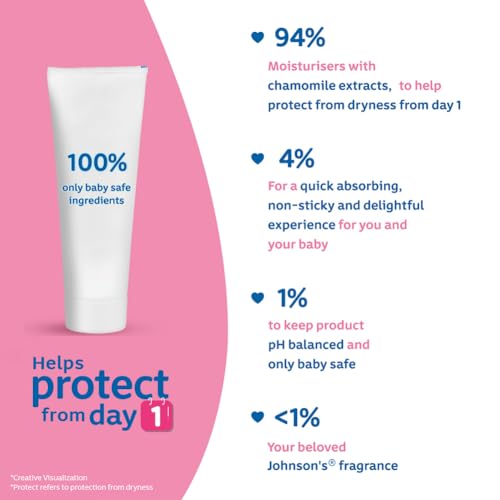 2 out of 3 babies have dry skin. We understand baby's delicate skin needs extra moisture to protect it from dryness so it stays baby soft always. Our Johnson's baby cream leaves baby skin soft for 24 hours. It contains chamomile extracts and makes his skin soft and smooth. Its fast absorbing formula contains rich emollients that help moisturize and preserve baby skin's natural softness to protect your baby from chapped knees rubbed elbows and tender noses.