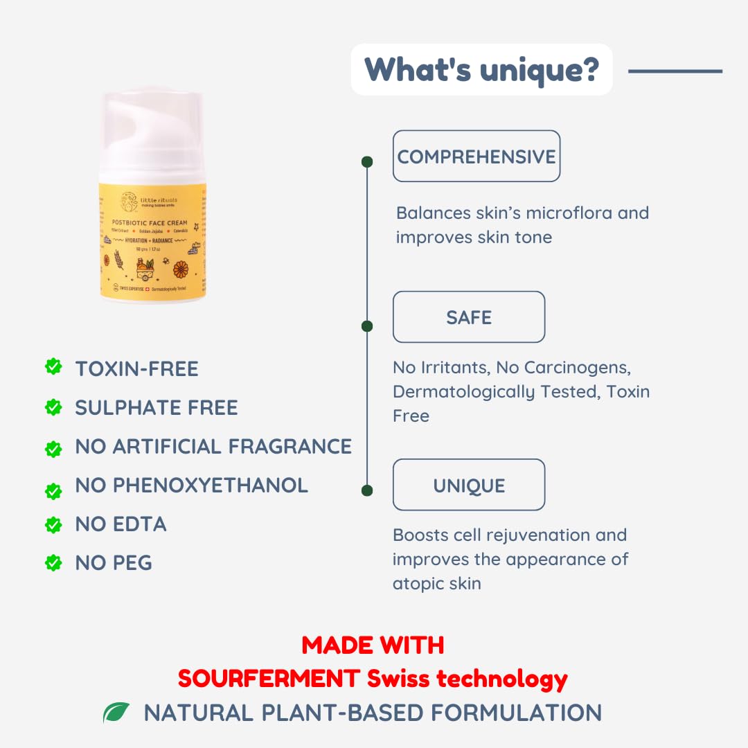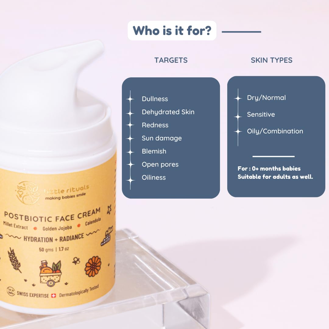 Little Rituals Baby and Kids Post-Biotic Face Cream Moisturiser - Hydration + Radiance, Formulated with Golden Millets, Jojoba, Calendula, Natural, Organic, Dermat Tested, Swiss Technology (50 gm)