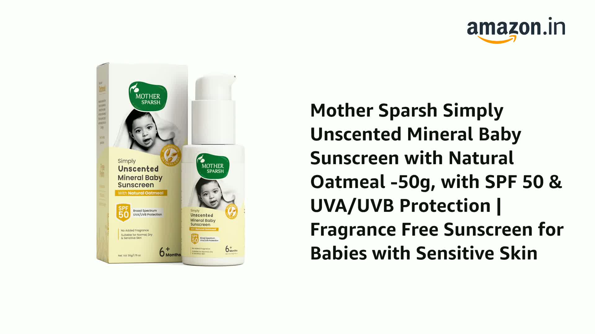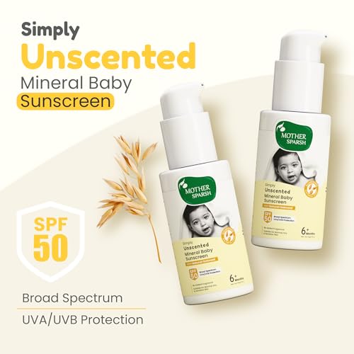 Mother Sparsh Simply Unscented Mineral Baby Sunscreen with Natural Oatmeal -50g, with SPF 50 & UVA/UVB Protection | Fragrance Free Sunscreen for Babies with Sensitive Skin