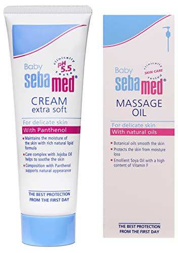 Sebamed Baby Massage Oil 150ml100 Percent botanical non sticky massage oil. Superior spread ability and faster absorption. Conventional massage oils contain mineral oil colorants and other irritants which can cause allergic reactions. Sebamed soothing massage oil contains 95 percent soy oil contains essential fatty acids which ensures superior hydration. 5 Percent wheat germ oil is the richest source of vitamin e. Sebamed soothing massage oil does not solidify at lower temperature made in Germany gentle care and protection of baby sensitive skin emollient with 95 percent natural soya oils high content of formula with vitamin f a soya oil compound insures high skin tolerability gentle protection for delicate baby skin ideal from day 7 2 years0 percent irritant reactions and almost 0 percent allergic reactions.Sebamed Baby Cream Extra Soft 50mlPh 5. 5 + 42% Natural lipids maintain and repair protective skin barrier. Conventional creams have ph 7 which can further damage the skin barrier leading to more dryness. Sebamed baby cream is clinically proven to be effective in atopic babies and soothes baby's sensitive skin. Made in Germany forms a non-occlusive protective film against dryness and irritation rich in panthenol allantoin and chamomile extract the moisturizing and protective complex soothes and regenerates irritated skin easy to apply and readily absorbed42% lipid composition water-in-oil emulsion supports the natural lipid balance pleasant botanical fragrance ideal from one month onwards clinically proven a significant improvement of erythema and rough skin in only eight weeks shown in studies. 56% Reduction in flaking / 2 times increase in lipid levels within 2 weeks * [*source: - adapted from sebapharma product manual sebapharma Germany]0% irritant reactions / almost 0% allergic reactions* [*source: - adapted from sebapharma product manual sebapharma Germany]