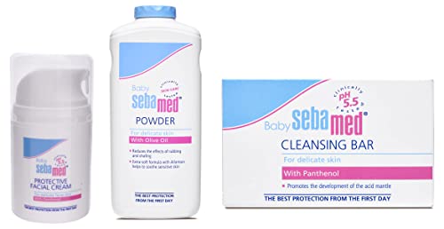 Sebamed Baby Protective Facial Cream (50ml)The moisturizing complex of hyaluronic acid and squalene prevents dryness and enhances the protective acid mantle of baby's very delicate facial skin. Panthenol vitamin e and lipid compounds protect against irritation also due to salivary rash. Light textured cream which does not leave any greasy residue. Sebamed baby protective facial cream is free from paraffin/ parabens/ formaldehyde/ dioxin made in Germany effective hydration prevents dryness panthenol and lipid compound protect against irritation around the mouth from saliva vitamin e safeguards against harmful environmental influences on occlusive rich in panthenol and allantoin to soothe and regenerate irritated skin easy to apply and readily absorbed oil in water emulsion ideal from one month onwards clinically proven the barrier function of the skin and hydration were improved. Hydration level increased by 13 percent and tewl decreased by 46 percent.Sebamed Baby Powder 200gMicronized form of tio2 reduces the effect of rubbing and chafing.