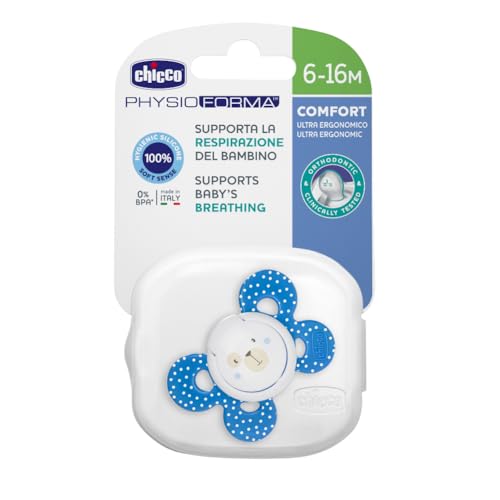 Chicco PhysioForma Utra Ergonomic Pacifier for Babies (6-16 Months) (1 Pc) (Any Colour) | Baby Teether/Soother with Unique Shape to Support Baby's Breathing | Soft Silicon Material | BPA Free (Blue)