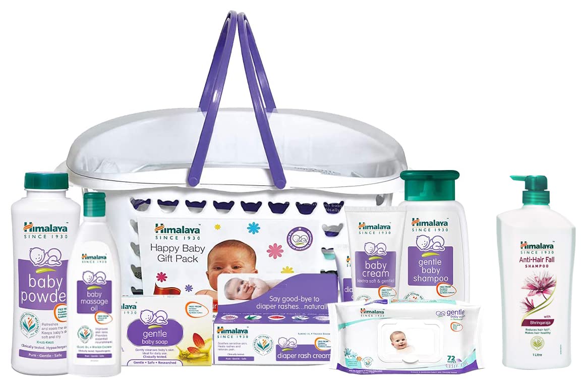 Himalaya Baby Gift Pack BasketPack of 1 setwhiteHimalaya Baby Gift Pack BasketPack of 1 setwhite A Complete Baby Care Gift Basket Himalaya Herbals bring you a complete range of baby skincare products for your little angel's delicate skin. The baby gift pack gives you a whole range of products attractively put together in a compact re-usable basket. Easy to carry this Himalaya babycare gift basket contains Baby Cream 50 ml Baby Massage Oil 100 ml Baby Powder 100 g Diaper Rash Cream 20 g Gentle Baby Wipes 72 count Gentle Baby Shampoo 200 ml and a Gentle Baby Soap 125 g. All these products are dermatologically tested and proven clinically mild enough for daily use on your baby's gentle skin. This gift basket for kids is ideal for naming ceremonies or even for your own little one's personal use. Herbal Protection for Your Precious One The Himalaya baby gift pack is a thoughtful assortment of herbal products and are free from harsh chemicals. For instance its baby cream has olive oil licorice and Country Mallow as key ingredients that nourish protect and provide lustre to your baby's tender skin with their anti-microbial properties. Its baby massage oil has goodness of olive oil and winter cherry that soften the skin tone and provide nourishment for overall growth and development. Infused with the essence of almond oil and Aloe Vera its diaper rash cream has anti-inflammatory anti-bacterial and soothing properties to heal rashes. Cleanse your baby's tender skin with the cooling lotus extracts found in Himalaya baby wipes. Give complete herbal protection to your child with this Himalaya baby care kit. Includes Baby cream 50 ml Baby Massage oil 100 ml Baby Powder 100 g Diaper rash cream 20 g Gentle Baby Wipes 72 nos Gentle Baby Shampoo 200 ml Gentle Baby Soap 125 g Perfect gift for newborns Clinically proven productsHimalaya Anti-Hair Fall Shampoo | Helps Reduce Hair Fall | Makes Hair Healthy | With the goodness of Bhringraja & Palasha | For Women & Men | 1000mlIn this day and age several factors can affect the health of your hair. Some of the most common hair problems faced these days are hair fall dandruff damaged Hair frizzy hair split ends dry hair rough hair etc. Himalaya Anti-Hair Fall Shampoo is enriched with the goodness of Bhringraj and Palasha. It is 96% effective in reducing hair fall and stimulating hair growth. Our hair fall shampoo strengthens hair roots and aids in controlling hair fall. Himalaya Anti-Hair fall Shampoo is made with natural ingredients like Bhringraj and Palasha. Bhringraj is an age-old herb known to promote hair growth and Palasha helps reduce hair fall. Use Himalaya Anti-Hair Fall Conditioner after shampoo for best results.