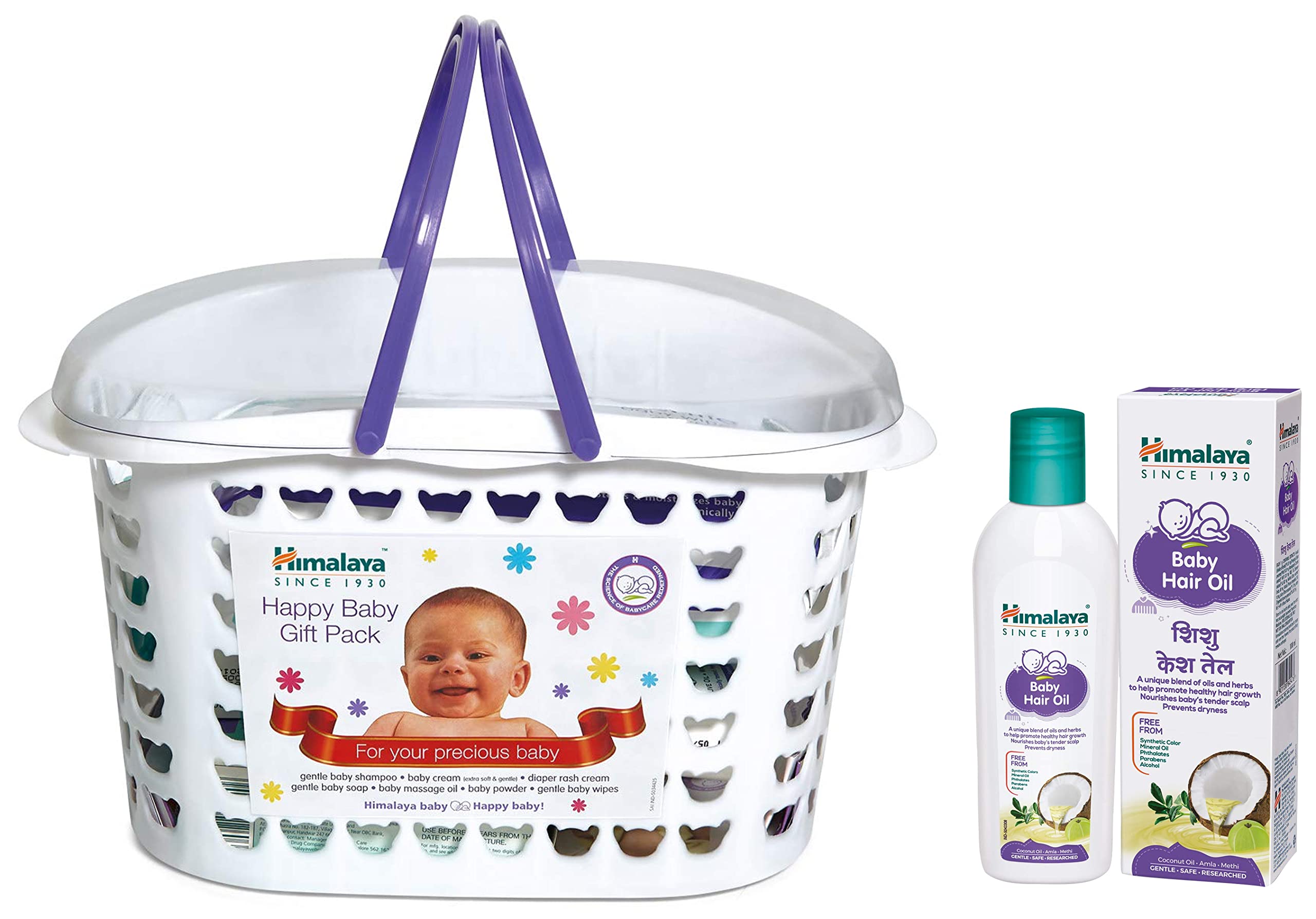 Himalaya Baby Gift Pack BasketPack of 1 setwhiteHimalaya Baby Gift Pack BasketPack of 1 setwhite A Complete Baby Care Gift Basket Himalaya Herbals bring you a complete range of baby skincare products for your little angel's delicate skin. The baby gift pack gives you a whole range of products attractively put together in a compact re-usable basket. Easy to carry this Himalaya babycare gift basket contains Baby Cream 50 ml Baby Massage Oil 100 ml Baby Powder 100 g Diaper Rash Cream 20 g Gentle Baby Wipes 72 count Gentle Baby Shampoo 200 ml and a Gentle Baby Soap 125 g. All these products are dermatologically tested and proven clinically mild enough for daily use on your baby's gentle skin. This gift basket for kids is ideal for naming ceremonies or even for your own little one's personal use. Herbal Protection for Your Precious One The Himalaya baby gift pack is a thoughtful assortment of herbal products and are free from harsh chemicals. For instance its baby cream has olive oil licorice and Country Mallow as key ingredients that nourish protect and provide lustre to your baby's tender skin with their anti-microbial properties. Its baby massage oil has goodness of olive oil and winter cherry that soften the skin tone and provide nourishment for overall growth and development. Infused with the essence of almond oil and Aloe Vera its diaper rash cream has anti-inflammatory anti-bacterial and soothing properties to heal rashes. Cleanse your baby's tender skin with the cooling lotus extracts found in Himalaya baby wipes. Give complete herbal protection to your child with this Himalaya baby care kit. Includes Baby cream 50 ml Baby Massage oil 100 ml Baby Powder 100 g Diaper rash cream 20 g Gentle Baby Wipes 72 nos Gentle Baby Shampoo 200 ml Gentle Baby Soap 125 g Perfect gift for newborns Clinically proven productsHimalaya Baby Hair Oil 200 ml(1 Count)About Himalaya Baby Hair Oil: Himalaya Baby Hair Oil is specially formulated for babies and is designed to nourish scalp and hair. Infused with a blend of oil and herbs Himalaya Baby Hair Oil helps promote hair growth nourish hair and prevent dryness and keeps the scalp moisturized. Benefits of Himalaya Baby Hair Oil Infused with the goodness of Amla Bhringaraja Gotu kola and Methi which are known to promote hair growth and luster Enriched with the nourishing oils of Coconut Sesame Almond and Olive Helps nourish scalp and hair Moisturizes dry and itchy scalp Free from mineral oil alcohol parabens synthetic color and phthalates Dermatologically tested clinically tested Non-sticky and non-staining