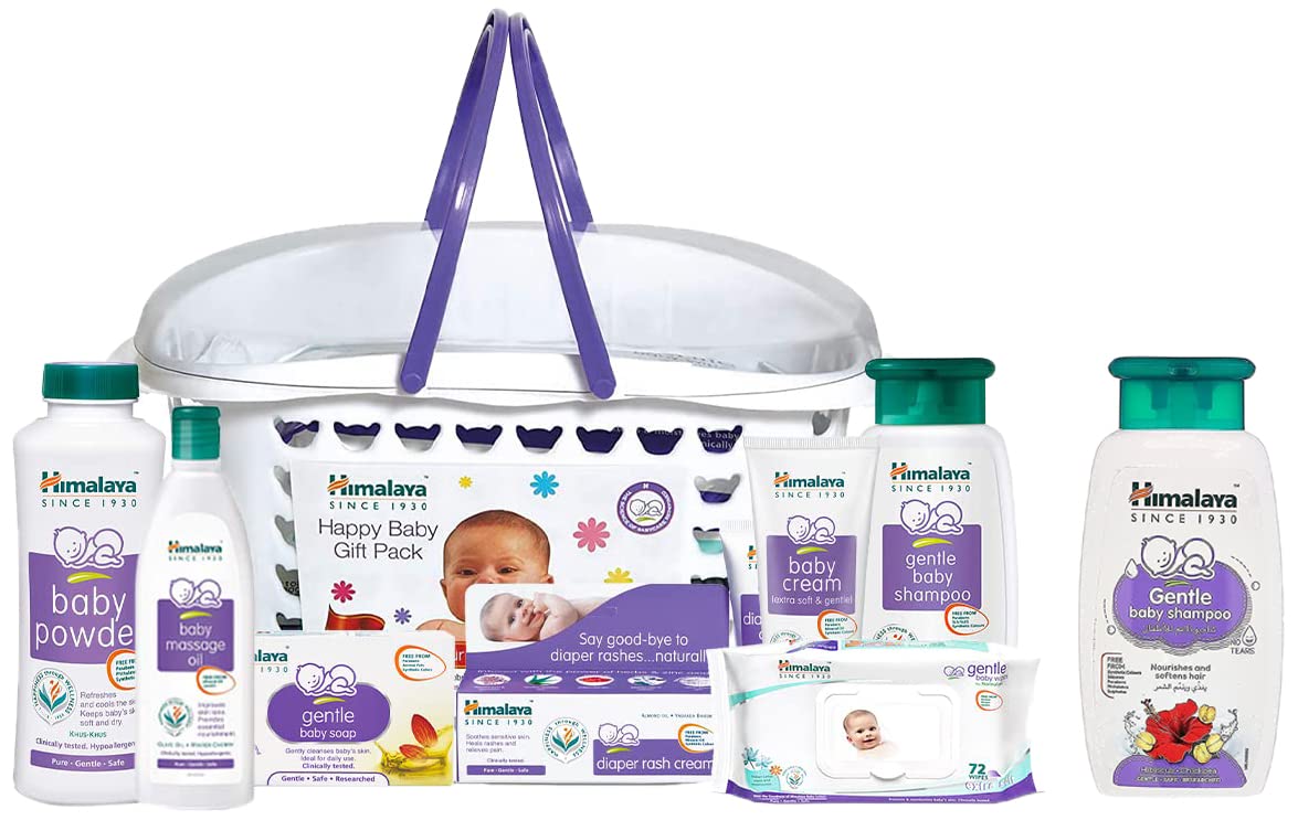 Himalaya Baby Gift Pack BasketPack of 1 setwhiteHimalaya Baby Gift Pack BasketPack of 1 setwhite A Complete Baby Care Gift Basket Himalaya Herbals bring you a complete range of baby skincare products for your little angel's delicate skin. The baby gift pack gives you a whole range of products attractively put together in a compact re-usable basket. Easy to carry this Himalaya babycare gift basket contains Baby Cream 50 ml Baby Massage Oil 100 ml Baby Powder 100 g Diaper Rash Cream 20 g Gentle Baby Wipes 72 count Gentle Baby Shampoo 200 ml and a Gentle Baby Soap 125 g. All these products are dermatologically tested and proven clinically mild enough for daily use on your baby's gentle skin. This gift basket for kids is ideal for naming ceremonies or even for your own little one's personal use. Herbal Protection for Your Precious One The Himalaya baby gift pack is a thoughtful assortment of herbal products and are free from harsh chemicals. For instance its baby cream has olive oil licorice and Country Mallow as key ingredients that nourish protect and provide lustre to your baby's tender skin with their anti-microbial properties. Its baby massage oil has goodness of olive oil and winter cherry that soften the skin tone and provide nourishment for overall growth and development. Infused with the essence of almond oil and Aloe Vera its diaper rash cream has anti-inflammatory anti-bacterial and soothing properties to heal rashes. Cleanse your baby's tender skin with the cooling lotus extracts found in Himalaya baby wipes. Give complete herbal protection to your child with this Himalaya baby care kit.