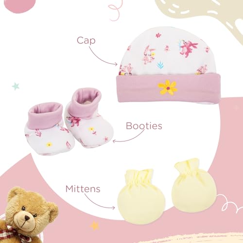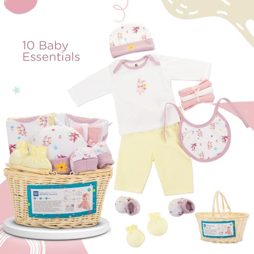 COTTON MATERIAL: Experience optimal comfort with baby clothing made from 100% breathable cotton ensuring your little one stays cool and cozy. STYLE STATEMENT: Elevate your baby's wardrobe with modern designs that make a stylish statement keeping them in vogue with the latest trends. CLOTHING ESSENTIALS FOR ALL-DAY WEAR: Discover clothing essentials designed for long all-day wear providing both comfort and durability for your baby's active moments. BEAUTIFUL RIBBON-WRAPPED GIFT BOX: Present your little one or loved ones with the cutest gifting option â our clothing comes beautifully packaged in a ribbon-wrapped gift box. PACK OF 10: T-shirts Pajamas Cap Napkins (3) Cloth Booty Mittens bibs