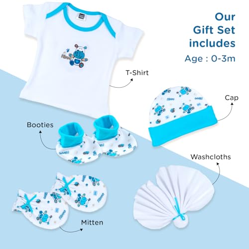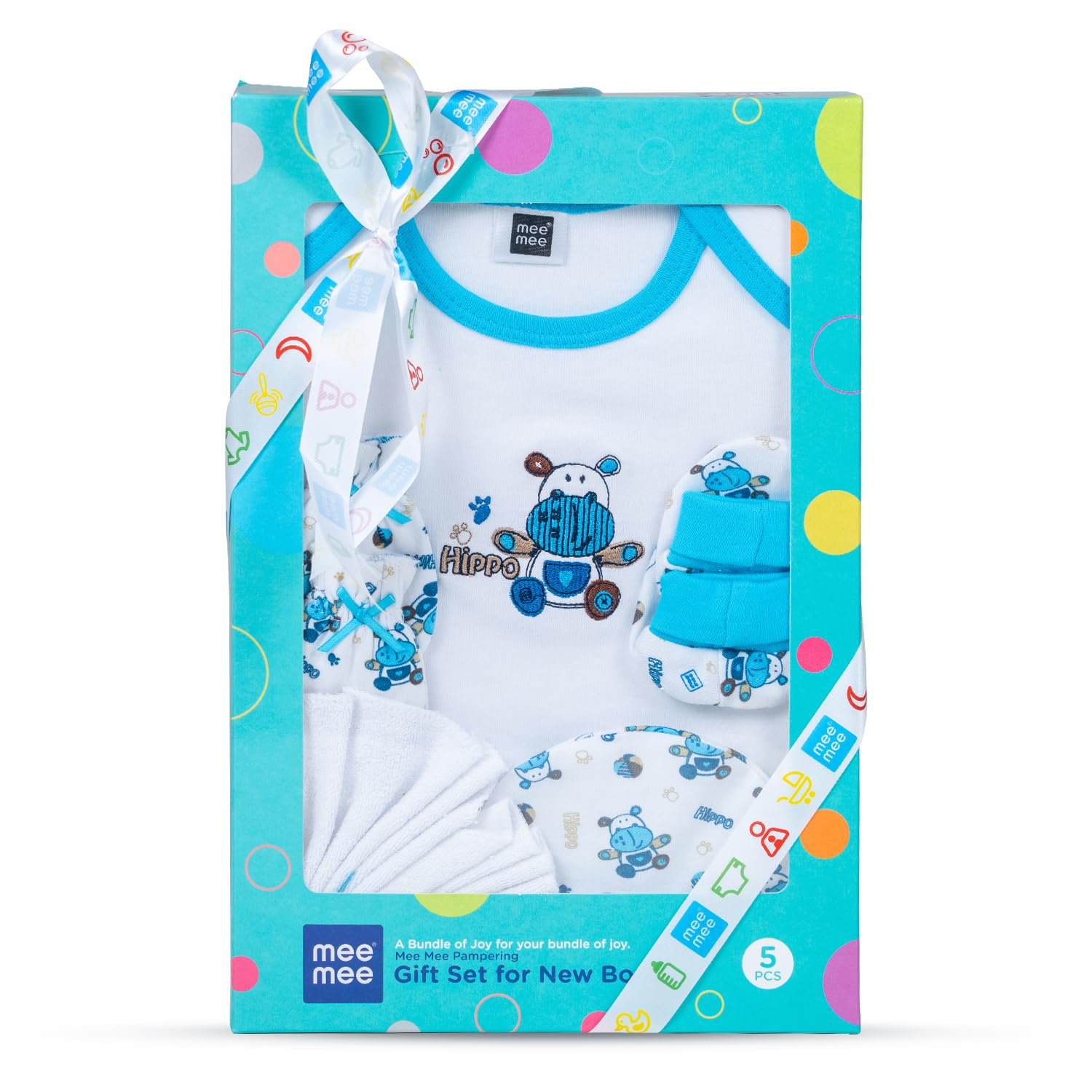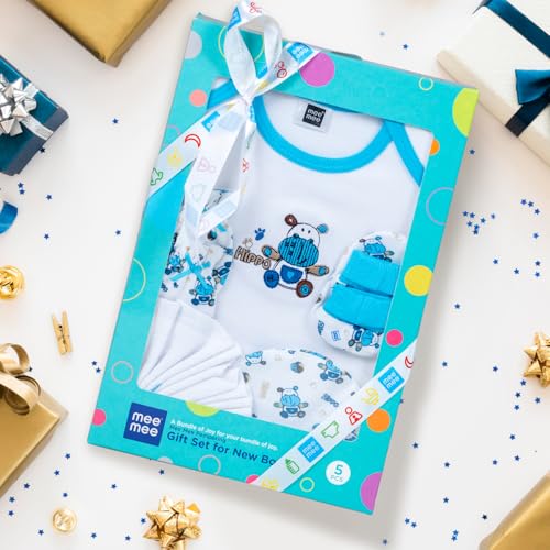 HomeBabyBath & SkinGift SetsMee Mee New Born Baby Gift Set | Soft Cotton Clothing Essentials for Infants/Baby Girls, Boys | Baby Shower Clothing Hamper (5 Pieces, Blue)| Ideal Gift for New Born Baby