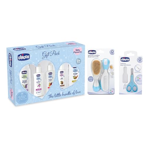 Baby Essential Gift Sets are made to celebrate for perfect gifting moments. It includes 5 must have products that are made with Advanced formula with natural ingredients for caring baby's skin from the very first moments. The pack contains: Mild Bodywash Relax 50ml Shampoo 50ml Body Lotion 50ml Soap 75g and Talcum Powder 75g. The Brush and Comb allows you to gently comb babys hair. The soft natural bristles of brush and comb teeth with rounded ends are ideal for baby`s delicate scalp. It has large handles that allow easy and safe grip. Chicco Nail Scissors have been specially designed for cutting the nails of the little ones. The secure grip finger holes are coated with non-slip rubber for added safety during use. Also a protective cap is included in the package to ensure maximum hygiene. The baby nail scissors are made of AISI420 stainless steel.