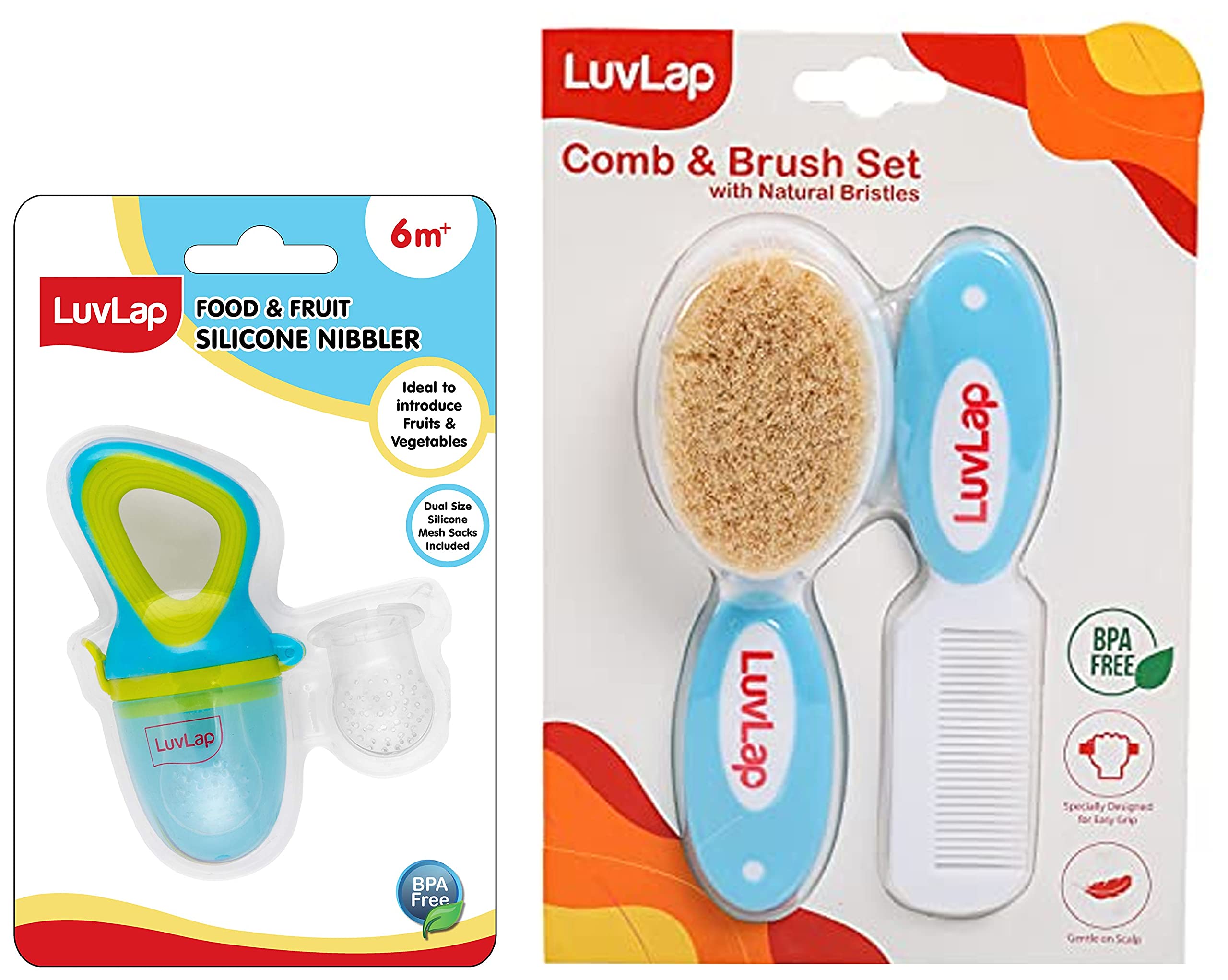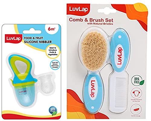 LuvLap Baby Comb with Rounded Tips & Baby Hair Brush with Natural Bristles for Better prrotection of Baby's Scalp (White & Blue)LuvLap Baby Comb with rounded Tips & Baby Hair Brush with Natural Bristles for better prrotection of baby's scalp (White & Blue)LuvLap Silicone Food/Fruit Nibbler with Extra Mesh Soft Pacifier/Feeder Teether for Infant Baby Infant Elegant Blue BPA FreeFruit nibbler and teething toy to provide gentle relief to gums. Serves dual purpose of feeding fruit and vegetables to babies and can also be used as a teether. Can be filled with chilled fruits/vegetables to provide added relief. Made with bpa free food grade plastic and soft silicone it comes in attractive handle designs to EN gage the baby and is easy to hold and nibble upon.