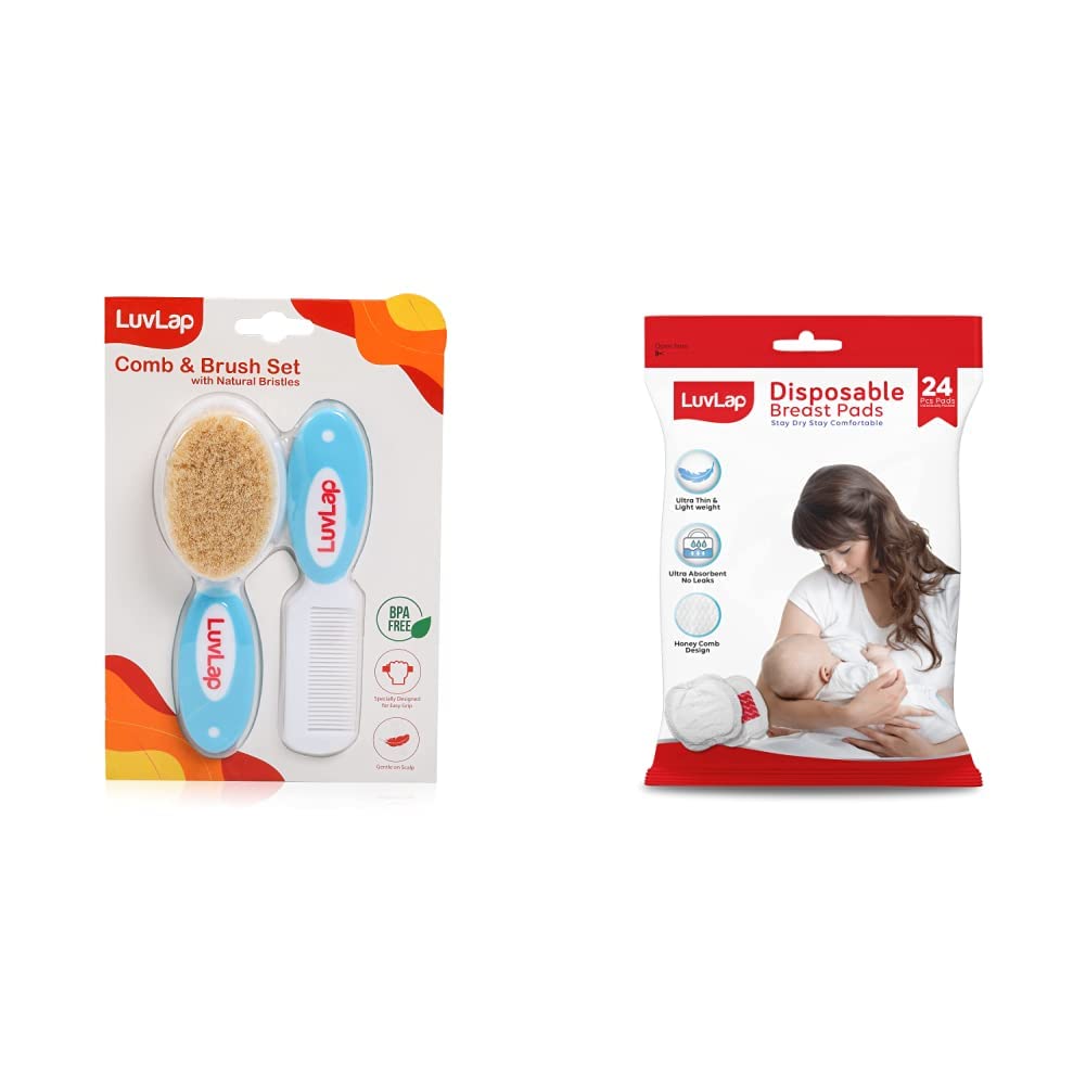 LuvLap Baby Comb with Rounded Tip & Baby Hair Brush with Natural Bristles for Baby Hair Grooming & Better Protection of Baby's Scalp (White & Blue)LuvLap Baby Comb with rounded Tips & Baby Hair Brush with Natural Bristles for better prrotection of baby's scalp (White & Blue)LuvLap Ultra Thin Honeycomb Nursing Breast Pads 24pcs Disposable High Absorbent Discreet FitLuvlap breast pads 24's pack super absorbent pad quickly absorbs excessive breast milk and locks in moisture for optimum dryness and comfort.