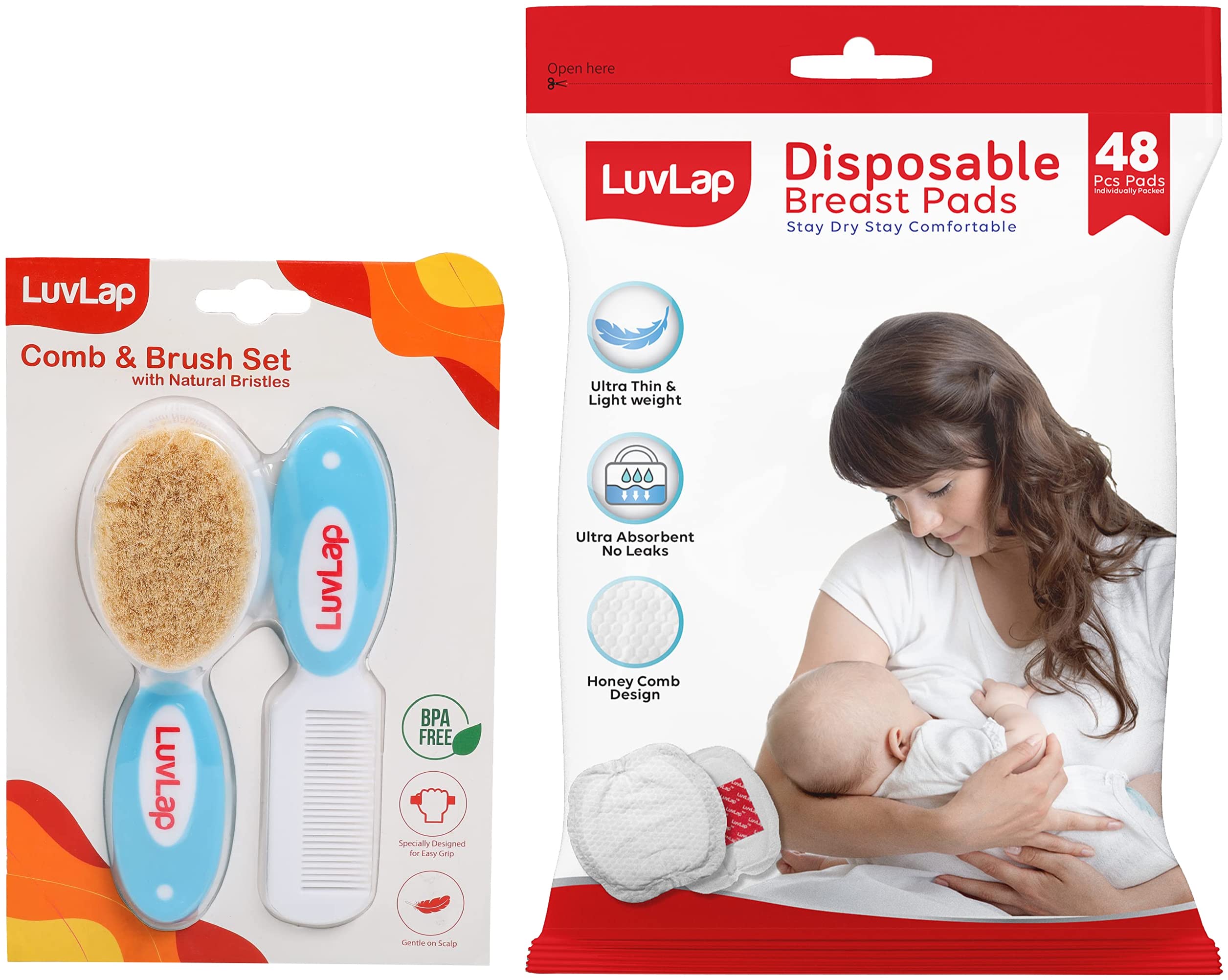 LuvLap Baby Comb with Rounded Tip & Baby Hair Brush with Natural Bristles for Baby Hair Grooming & Better Protection of Baby's Scalp (White & Blue)LuvLap Baby Comb with rounded Tips & Baby Hair Brush with Natural Bristles for better prrotection of baby's scalp (White & Blue)LuvLap Ultra Thin Honeycomb Nursing Breast Pads 48pcs Disposable High Absorbent Discreet FitLuvlap breast pads 48's pack super absorbent pad quickly absorbs excessive breast milk and locks in moisture for optimum dryness and comfort.