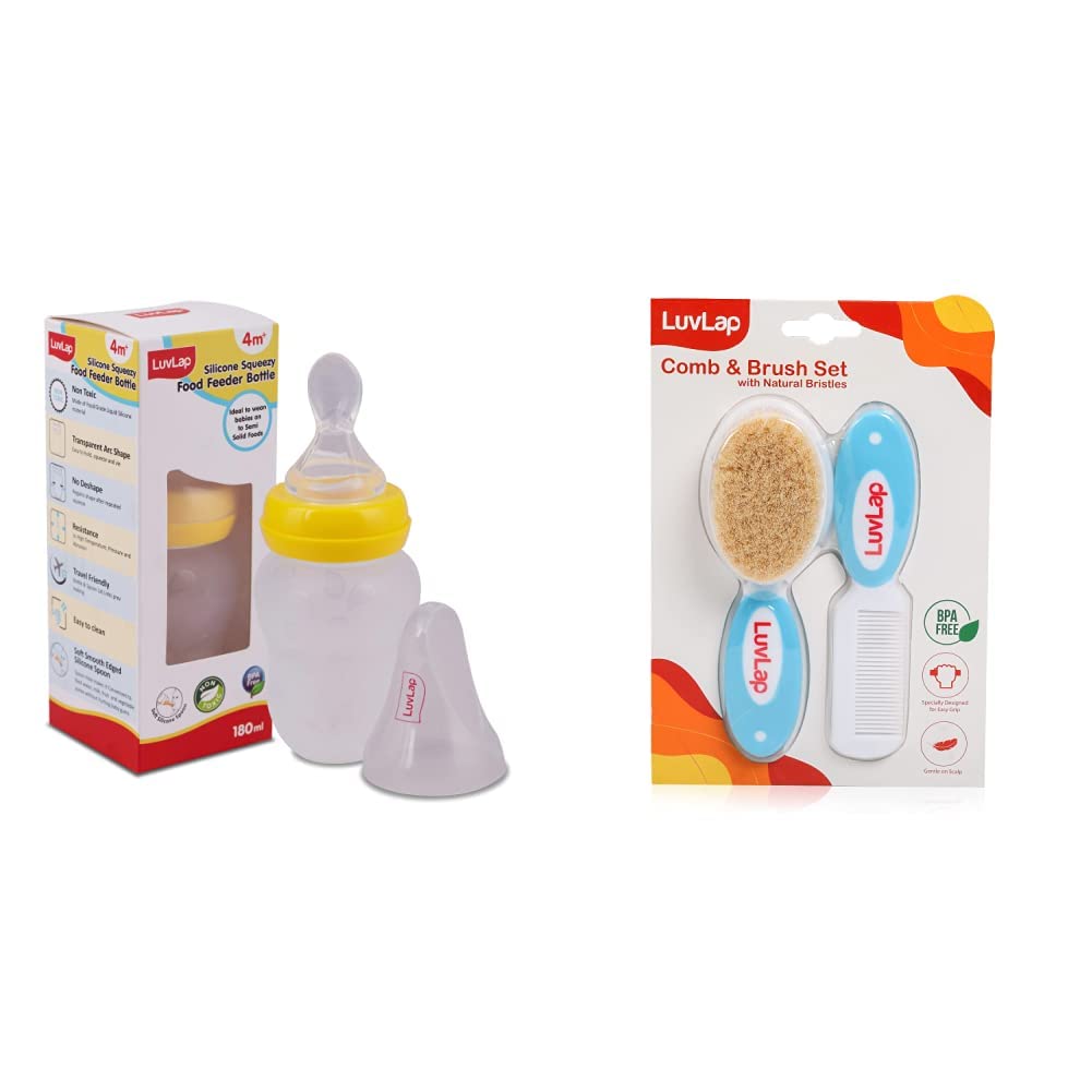 LuvLap Feeding Spoon with Squeezy food Grade Silicone Feeder bottle For Infant Baby 180ml BPA Free YellowSoft silicone food feeding bottle with spoon can be used to feed puries juice milk or water to babies. Helps in easy transition. Effortless one hand feeding. Extra soft silicone spoon protects baby's teeth. Dust cover to maintain hygiene.LuvLap Baby Comb with Rounded Tips & Baby Hair Brush with Natural Bristles for Better prrotection of Baby's Scalp (White & Blue)LuvLap Baby Comb with rounded Tips & Baby Hair Brush with Natural Bristles for better prrotection of baby's scalp (White & Blue)