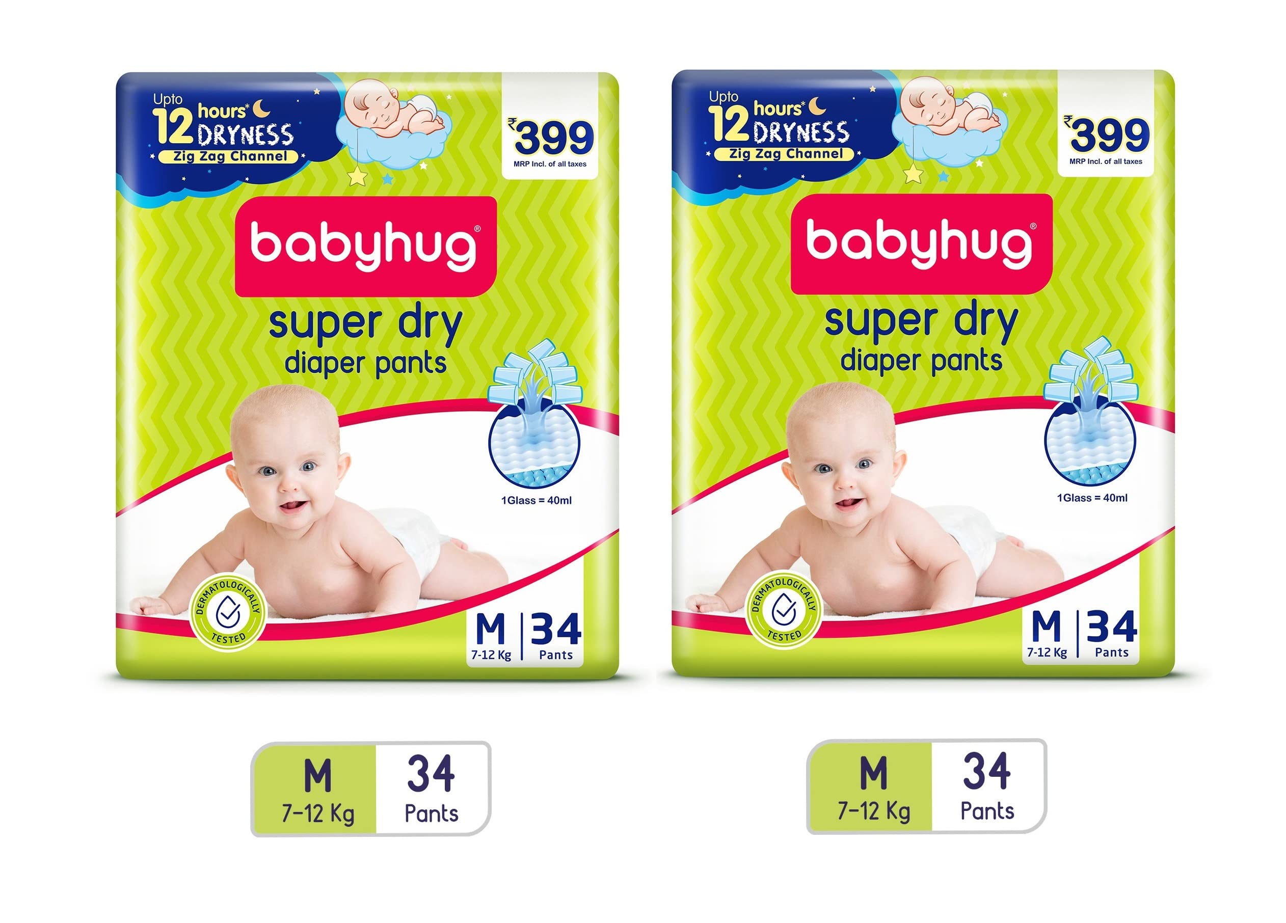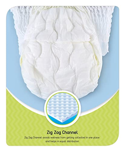 Soft & Comfortable Cottony Soft & Breathable Material: Helps to protect baby's sensitive skin Soft & Flexible Waist Band: Super Stretchy flexible elastic adapts to the baby's waist to give a comfortable fit 12 hours Dryness Zig zag technology Anti Rash & Gentle Anti-Rash Shield: Prevents risk of diaper rashes 3D leak guard Babyhug Type - Diapers Babyhug Pant Style Diaper comes with zig zag channel technology which helps in even flow quick absorption and dryness upto 12 hours. This special technology helps prevent heaviness of the diaper which is very important for your baby's comfort. The feather soft material and flexible waist band further enhances the comfort for your loved one.