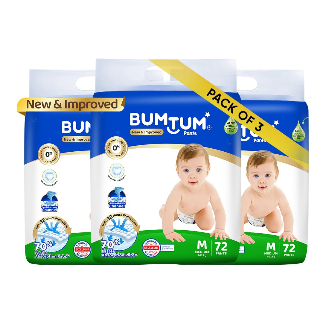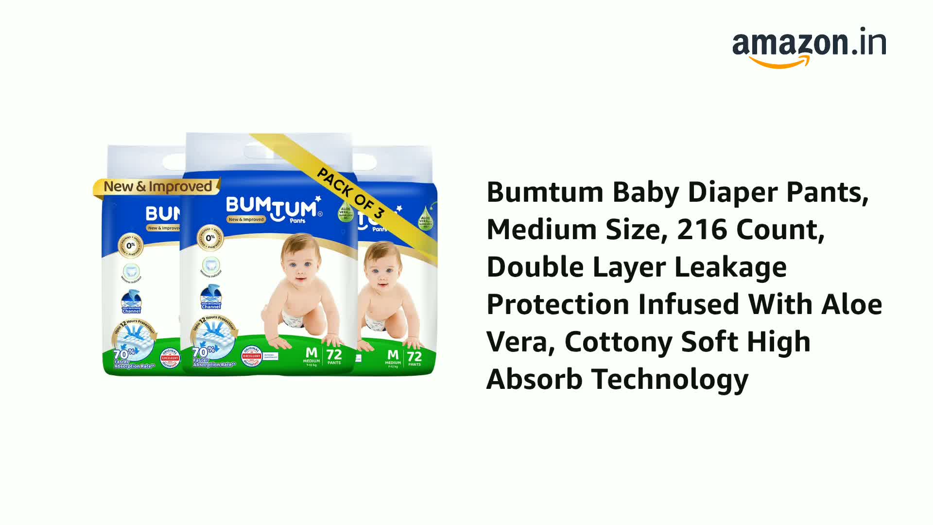 Bumtum Baby Diaper Pants, Medium Size, 216 Count, Double Layer Leakage Protection Infused With Aloe Vera, Cottony Soft High Absorb Technology