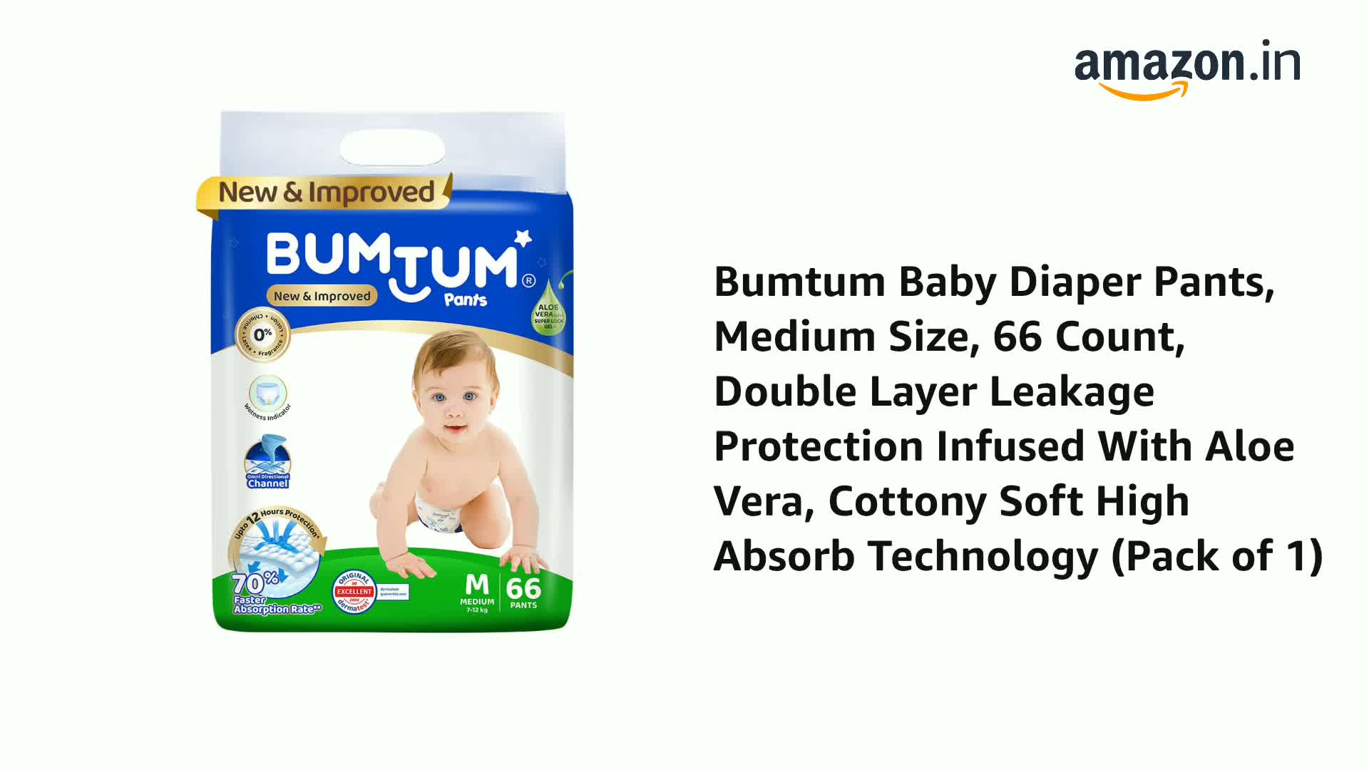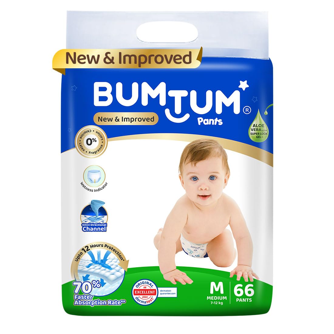 Bumtum Baby Diaper Pants, Medium Size 34 Count, Double Layer Leakage Protection Infused With Aloe Vera, Cottony Soft High Absorb Technology