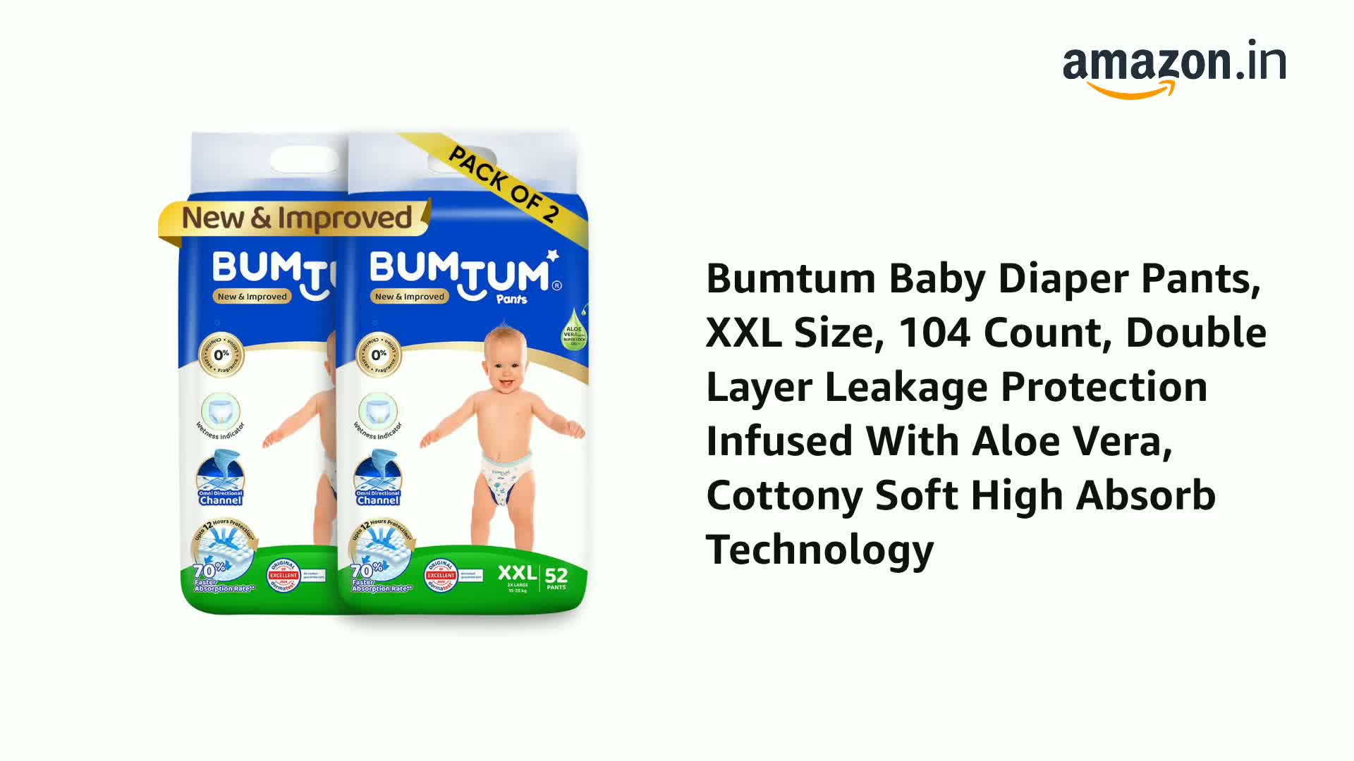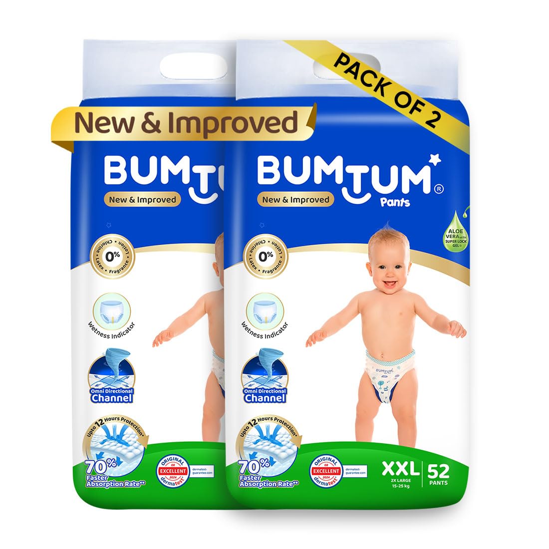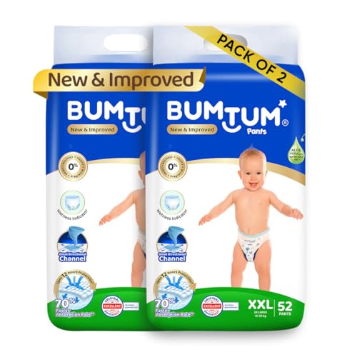 Bumtum Baby Diaper Pants, XXL Size, 104 Count, Double Layer Leakage Protection Infused With Aloe Vera, Cottony Soft High Absorb Technology