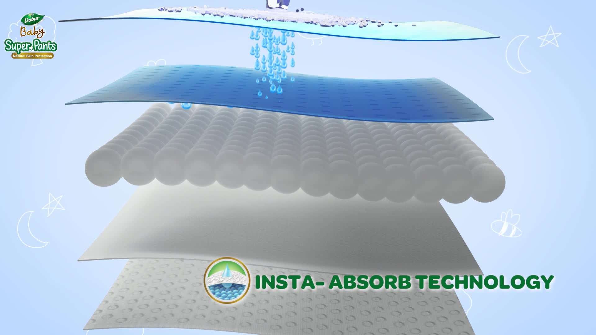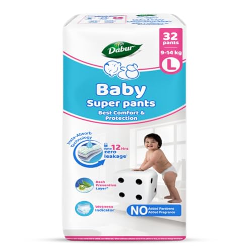 Dabur Baby Super Pants is a natural skin protection diaper exclusive for baby sensitive skin. It is infused with Aloe-vera Shea butter & Vitamin E to keep redness & rashes away. The diaper is designed with new Insta Absorb technology for high absorbency & 12 hrs zero leakage that help baby have a sound sleep all night long. The magic gel locks wetness & keeps skin dry overnight. The diaper enables a comfortable fit with its 360 stretch fit design for easy wear & movement. Available in sizes small diaper pants medium diaper pants & large size diaper pants.