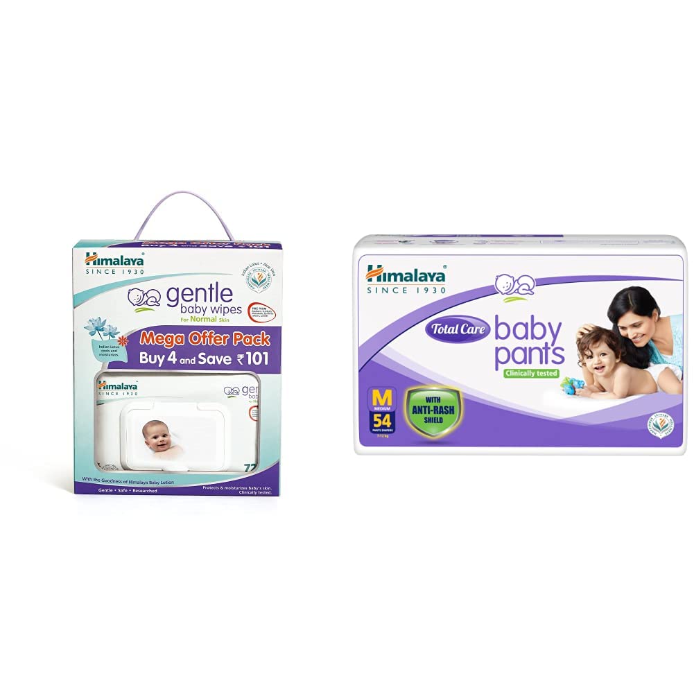 Himalaya Gentle Baby Wipes Mega Offer Pack (4N x 72's) Save Rs.101/-About Himalaya Gentle Baby Wipes: Infused with the goodness of Aloe Vera and Indian Lotus extracts Himalaya Gentle Baby Wipes are mild enough to soothe baby's bottom during a diaper change. Our wipes can also be used to gently cleanse baby's skin. Ideal for use when traveling.Himalaya Total Care Baby Pants Diapers Medium 54 CountAbout Himalaya Baby total care pants: Powered by natural antirash shield: Indian Aloe and Yashad Bhasma (Zinc Oxide) (that prevent risk of diaper rash) Soft easy-to-fit design offers care and comfort to your baby. silky soft inner layer for soft & sensitive skin Breathable fabric ensures proper air circulation and leakproof soft elastic edges prevent leakage. Superabsorbent polymer (SAP) layer: Rapidly absorbs multiple wettings and provides maximum protection from dampness. Wetness indicator: Turns green to show when baby wets the diaper. Keeps skin dry so that baby gets an undisturbed and restful sleep.